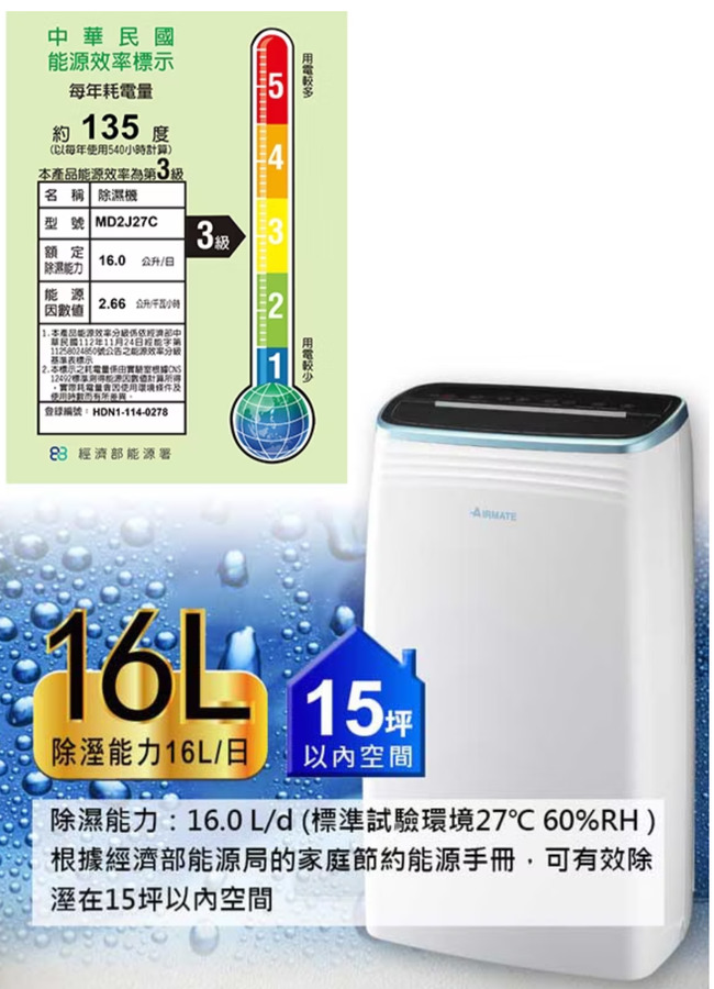 ◆ 除濕能力:16.0 L/d (標準試驗環境27℃ 60%RH )