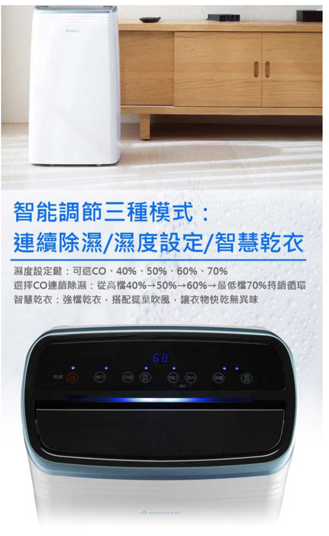 ◆智能調節三種模式:連續除濕/濕度設定/智慧乾衣