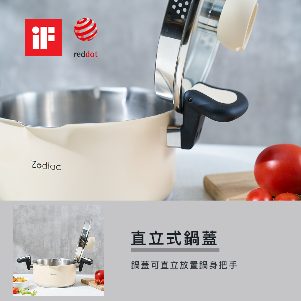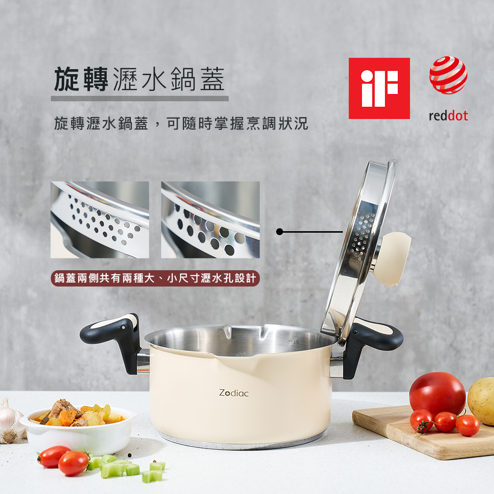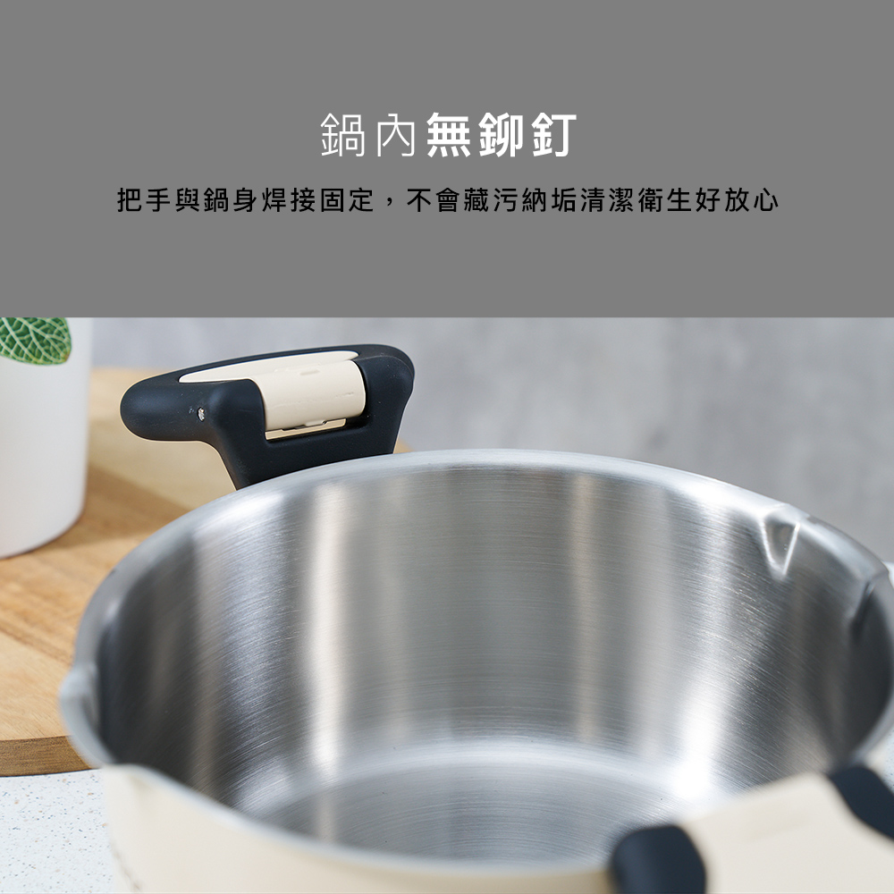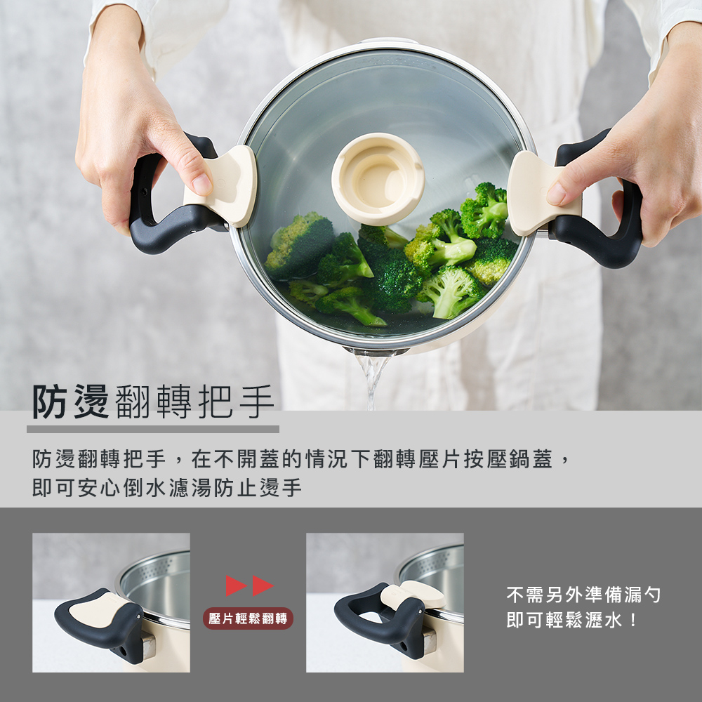 1.防燙翻轉把手,在不開蓋的情況下翻轉壓片按壓鍋蓋,即可安心倒水濾湯防止燙手。