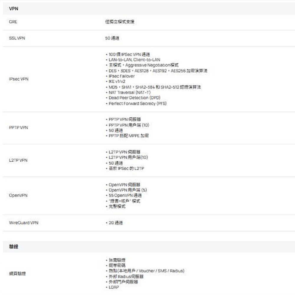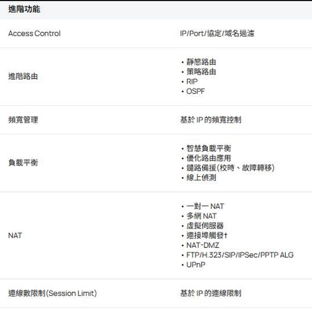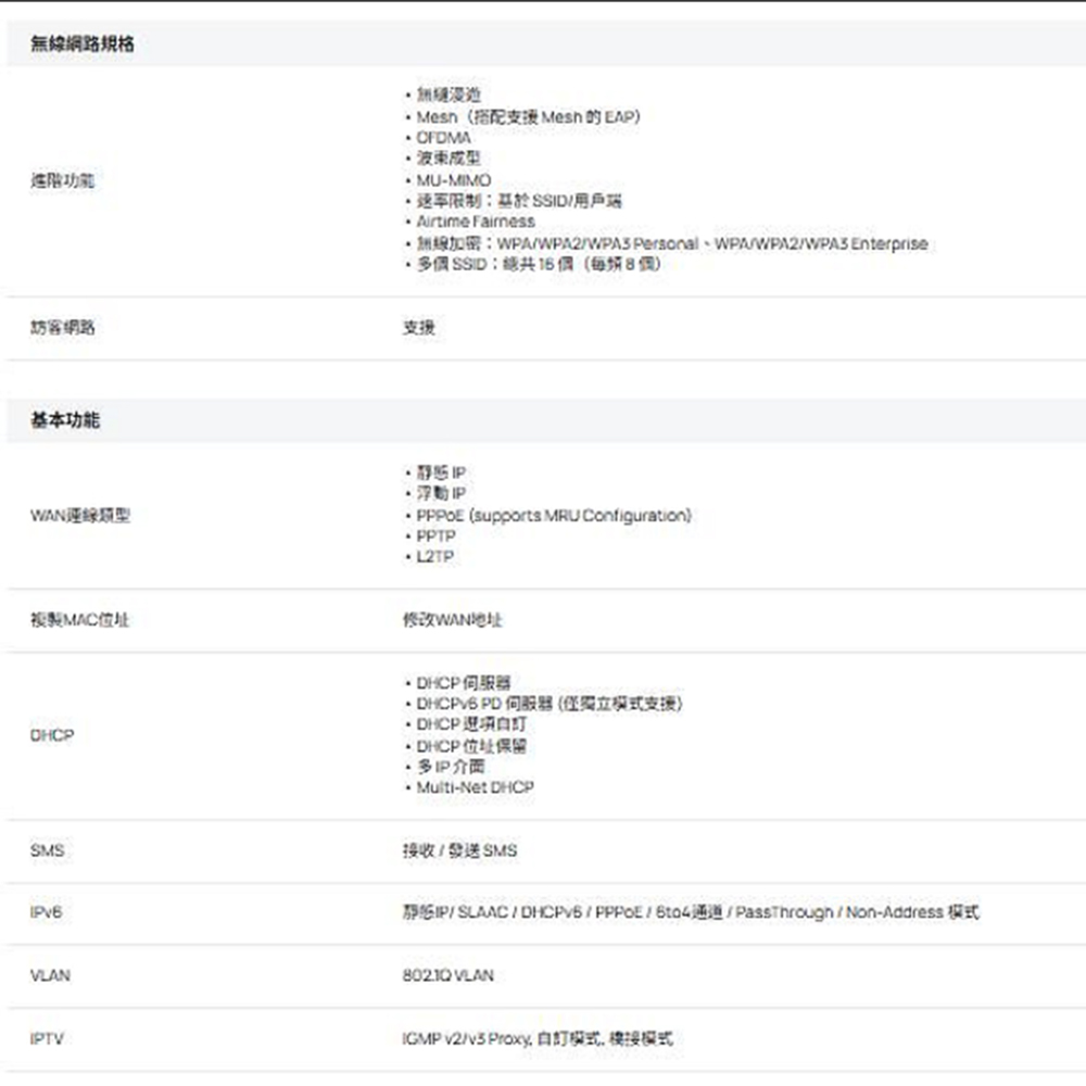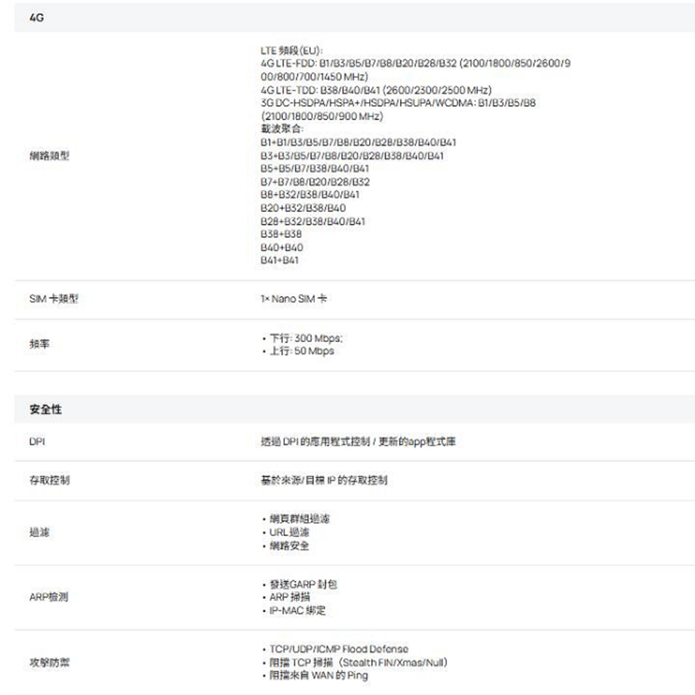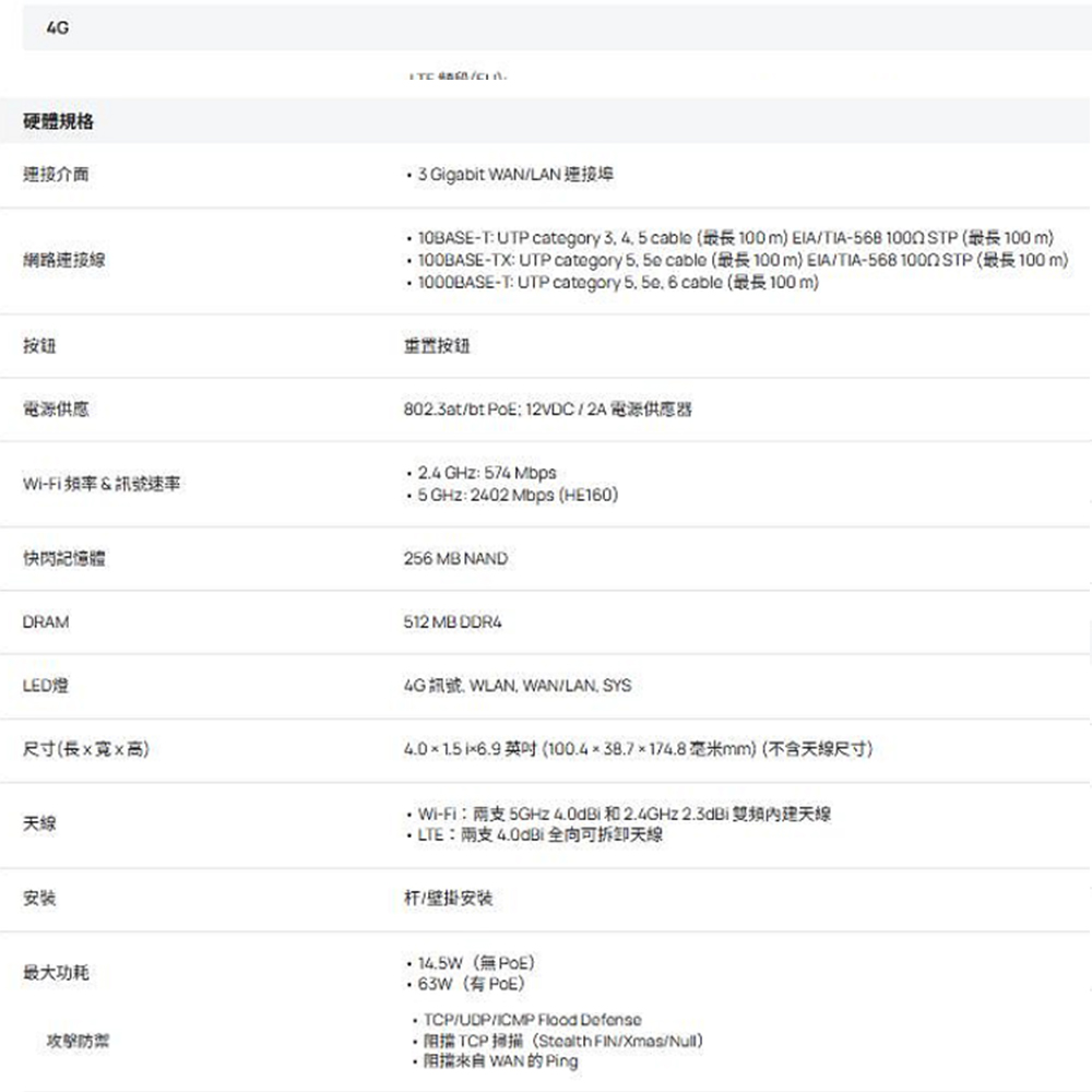 4G+ Cat6 高達 300 Mbps。 AX3000 Wi-Fi 6提供在5GHz頻段的2402 Mbps速度和在2.4GHz頻段的574 Mbps速度。 3 × Gigabit WAN/LAN連接埠(2 × PoE 輸出, 1 × PoE 輸入)。 1 × Nano SIM 卡槽。 802.3at/bt PoE 或 12V/2A DC電源供應。 4G以及乙太網路WAN自動備援和負載平衡功能。 IPSec/L2TP/PPTP/OpenVPN/GRE/WireGuard/SSL VPN。 集中管理。 IP55防水防塵等級。 BSMI: D38330 NCC: CCAH254G0250T2