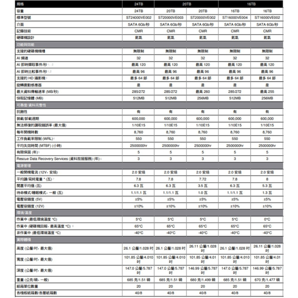 出類拔萃的可靠性和信賴度讓 SkyHawk AI 硬碟機達到 250 萬小時 MTBF 和 550TB/年的工作負載率評等,超出標準安全監控硬碟 3 倍之多。5 年有限責任保固背書。