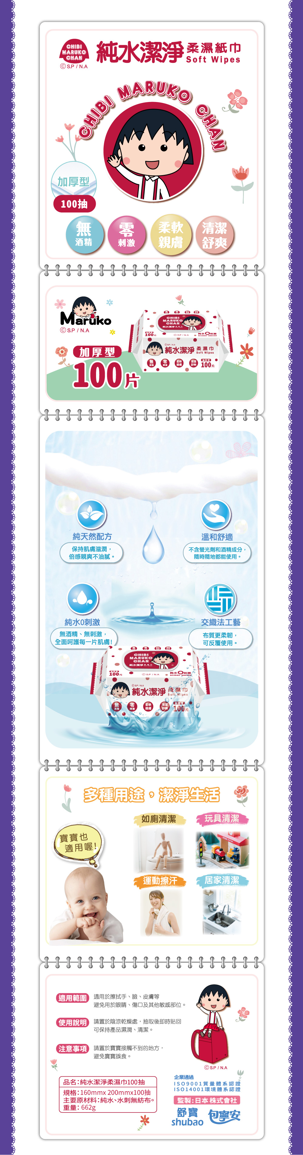 品名:【櫻桃小丸子】純水潔淨柔濕紙巾(100抽x12包) 類型:家用紙製品 規格:160mmx200mmx100抽x12包 保存期限:3年 產地:台灣設計中國生產