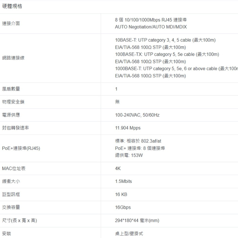 8× 10/100/1000Mbps RJ45 連接埠。 具備 8× 支援 PoE+ 的連接埠。 搭配相容於 IEEE 802.3af/at 的設備。