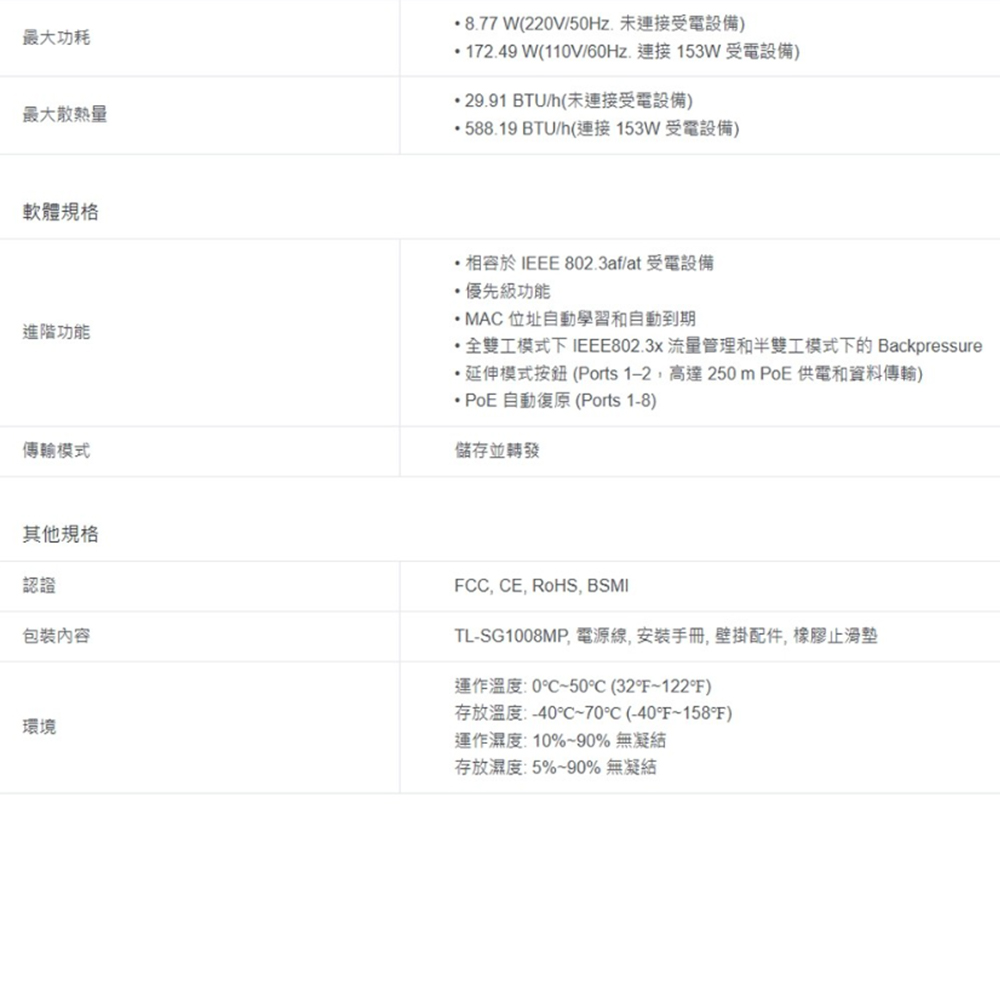TP-Link】TL-SG1008MP 8 埠 Gigabit 桌上型/機架式交換器(1PCS)