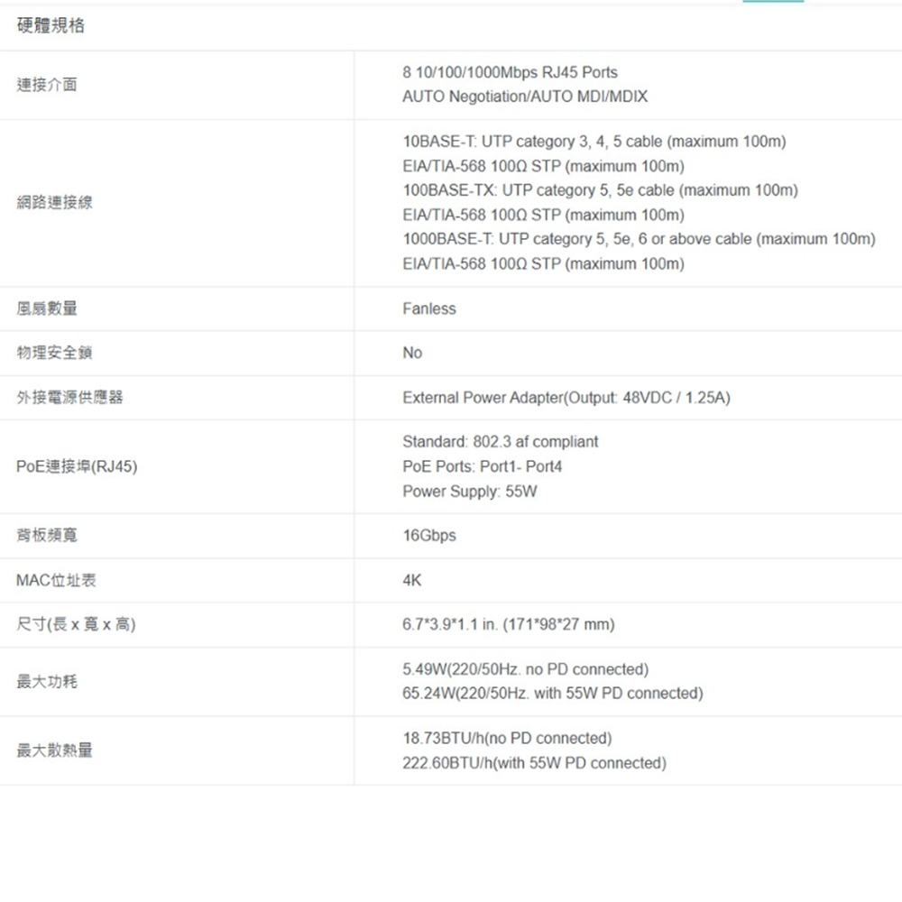 802.1p/DSCP QoS 支援平滑的延遲敏感型流量。 8 個 10/100/1000Mbps RJ45 連接埠。 具有四個 PoE 連接埠,可在一根電纜上傳輸數據和電源。