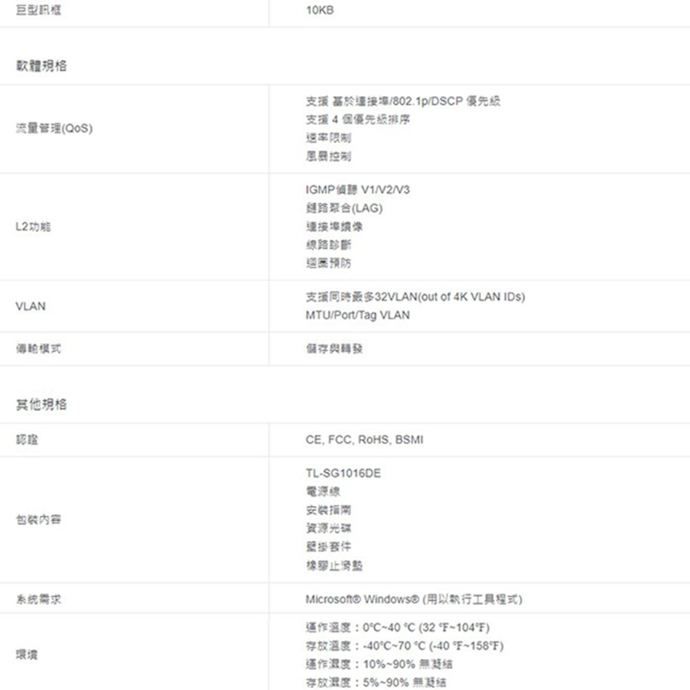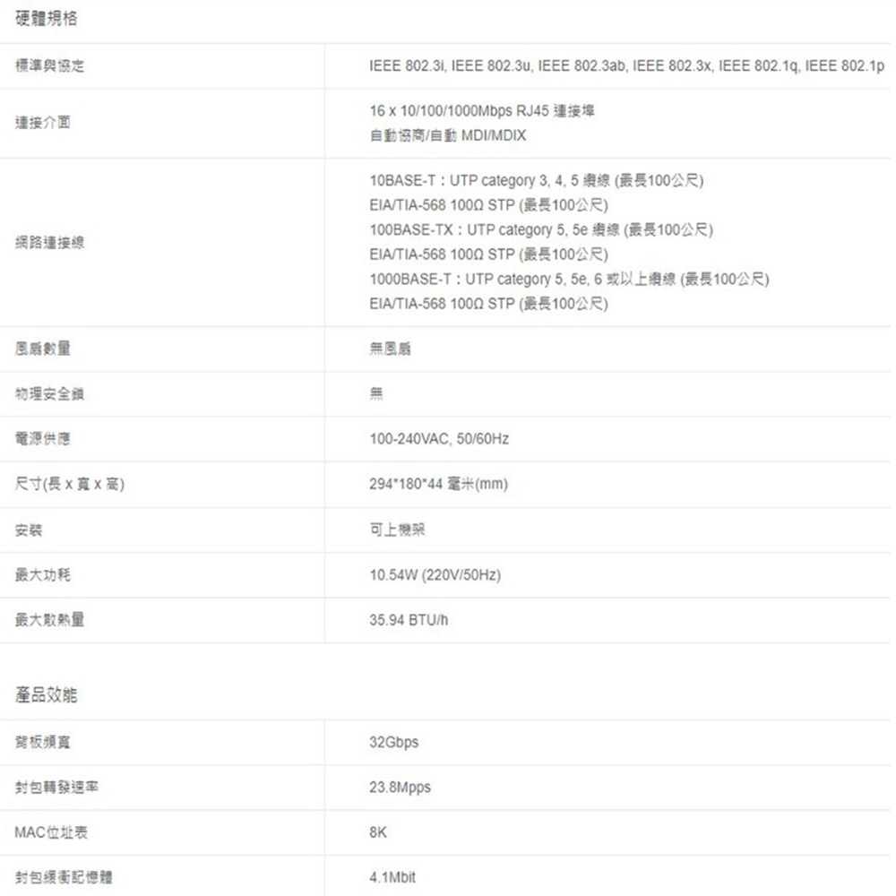 16 x 10/100/1000Mbps RJ45 連接埠。