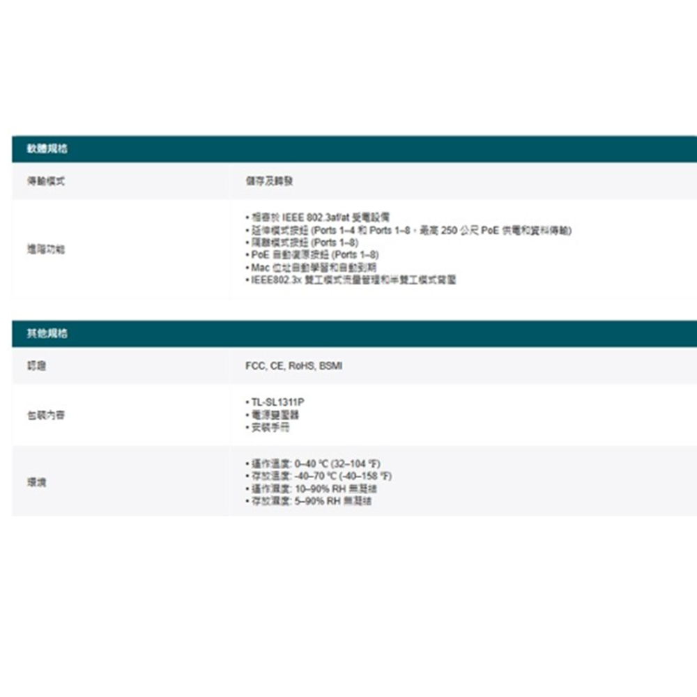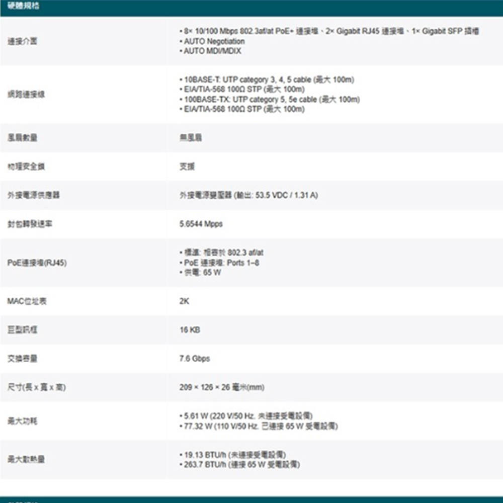 8× 10/100 Mbps RJ45 連接埠、2× Gigabit RJ45 連接埠、1× Gigabit SFP 插槽。