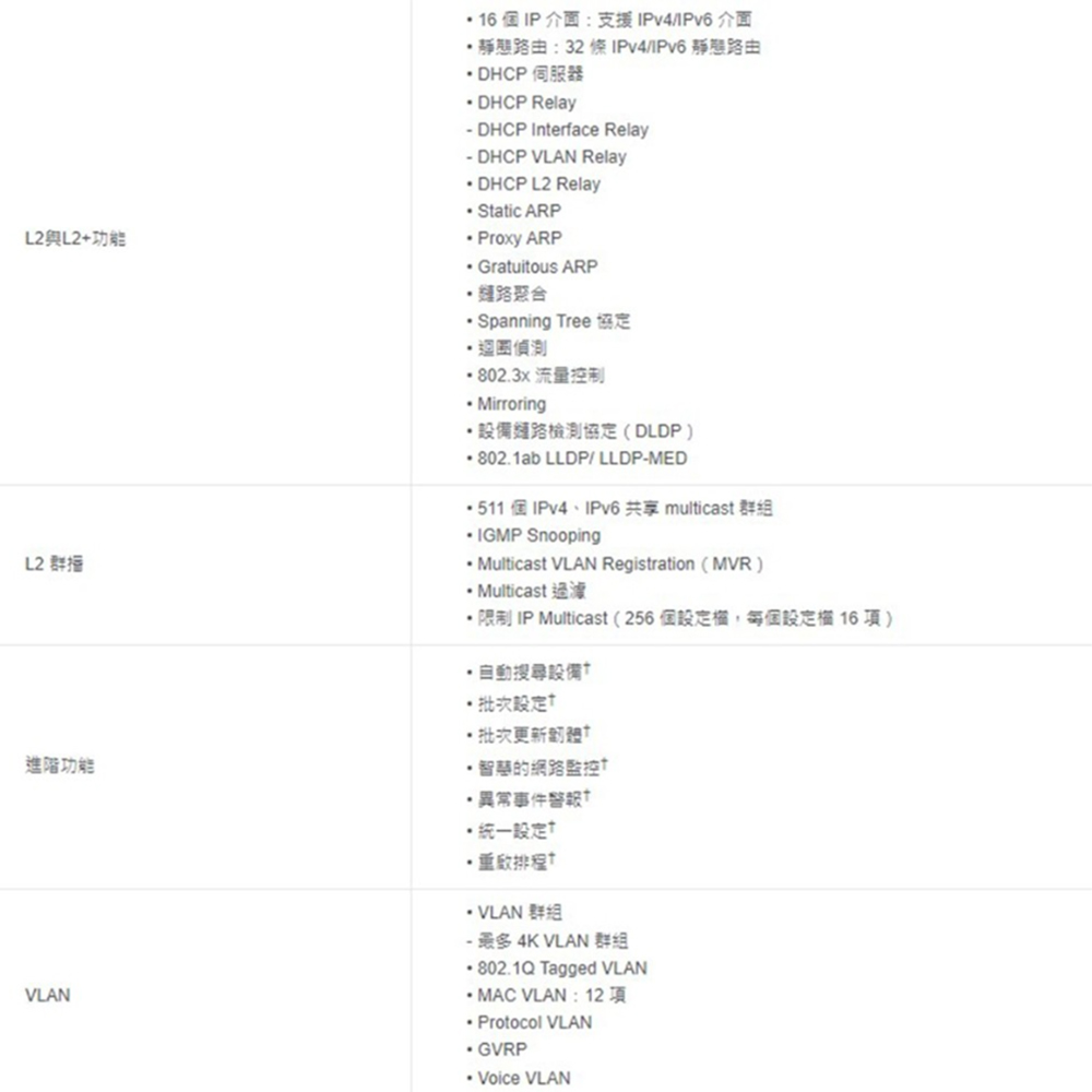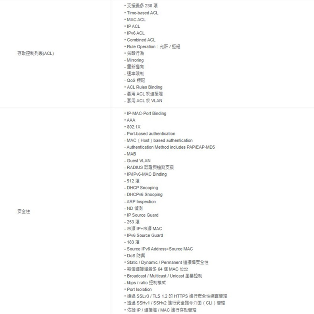 牢不可破的安全性策略: 提供 IP-MAC-Port 綁定、ACL、埠口安全性、DoS 防護、風暴控制、DHCP 偵聽、802.1X、Radius 驗證等進階安全管理功能。