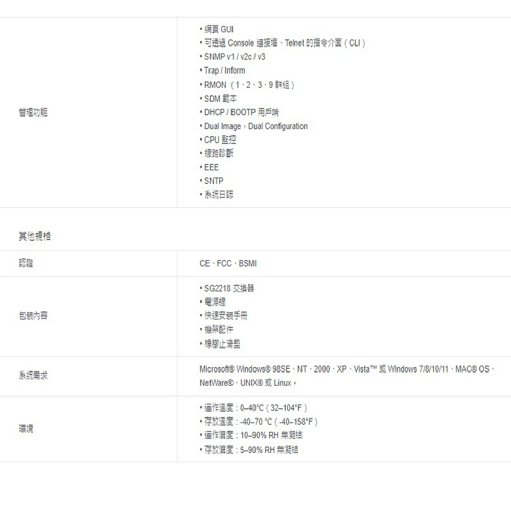 獨立管理: 可透過網頁、CLI (Console 連接埠、Telnet、SSH)、SNMP、RMON 和雙重影像進行管理。