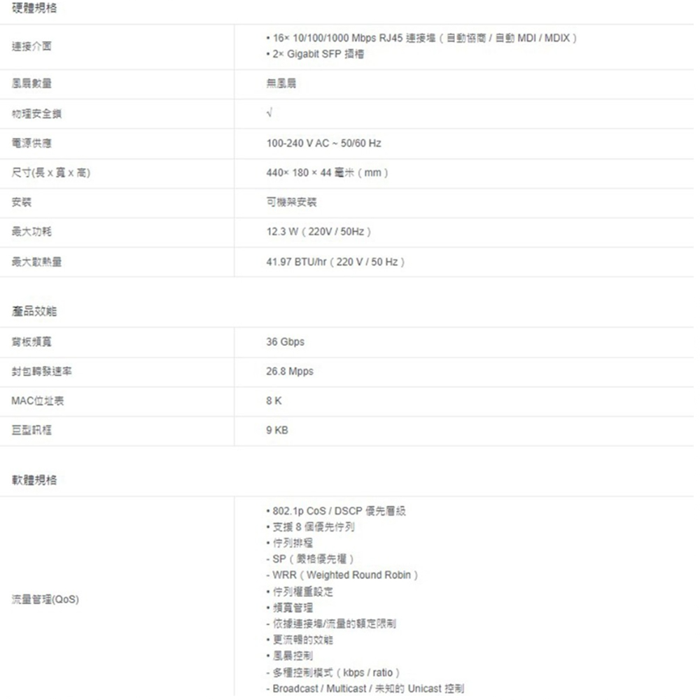 全 Gigabit 連接埠: 16× gigabit RJ45 RJ45 連接埠和 2× gigabit SFP 插槽提供高速連線。