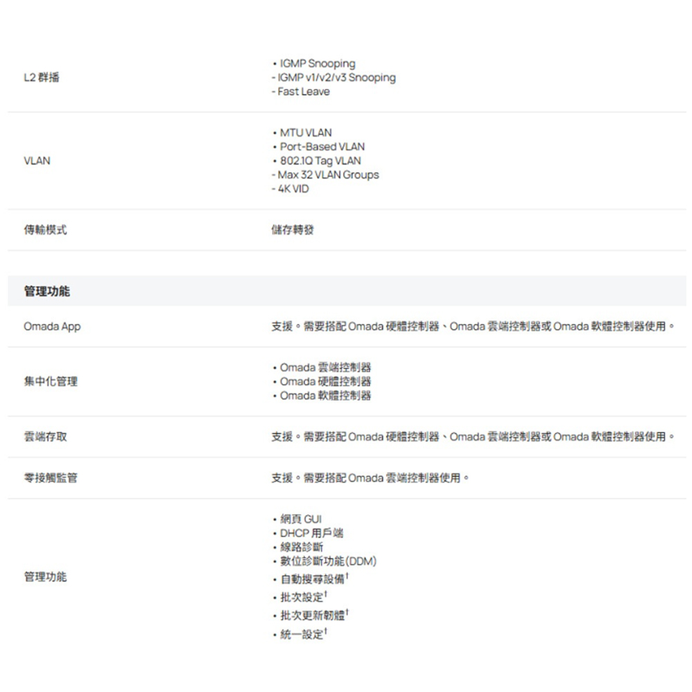 4× Gigabit RJ45 連接埠 (1× PoE++、3× PoE+)。 1× Gigabit Combo RJ45/SFP 插槽、1× Gigabit SFP 插槽。 120W 總供電,每個 PoE++ 連接埠高達 60W。 專業工業級設計:-40~75°C 運作溫度、6kV 防雷、1+1 冗餘電源輸入。 高達 250m PoE, VLAN, QoS 以及 STP/RSTP。 透過網頁或 Omada App 進行集中雲端管理。 耐用的 IP40 鋁製外殼和 DIN 導軌 / 壁掛設計。