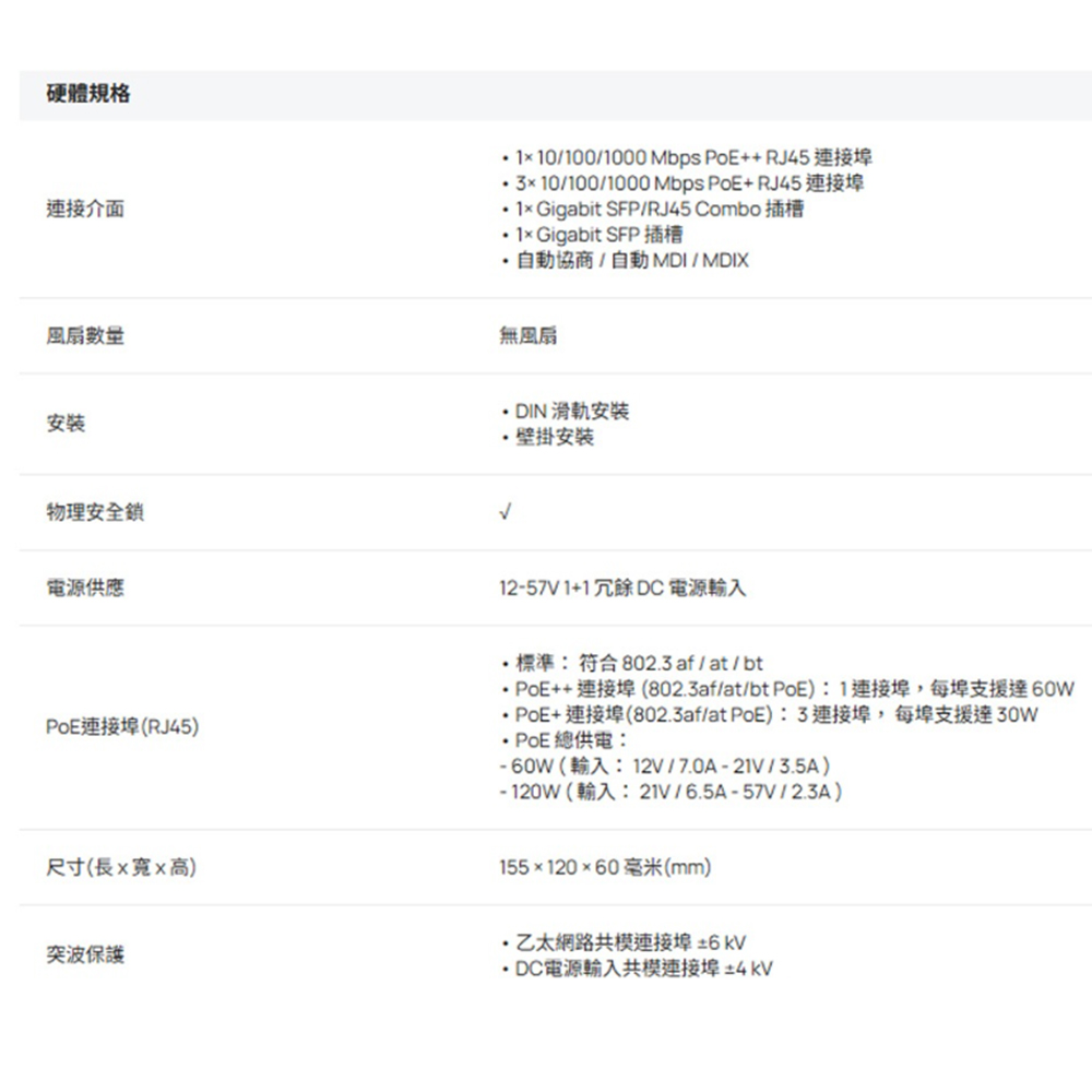 4× Gigabit RJ45 連接埠 (1× PoE++、3× PoE+)。 1× Gigabit Combo RJ45/SFP 插槽、1× Gigabit SFP 插槽。 120W 總供電,每個 PoE++ 連接埠高達 60W。 專業工業級設計。