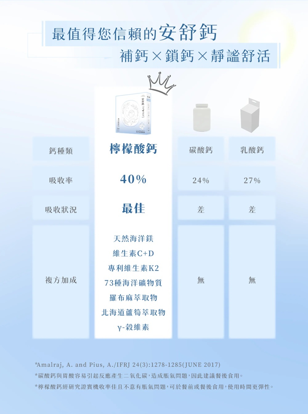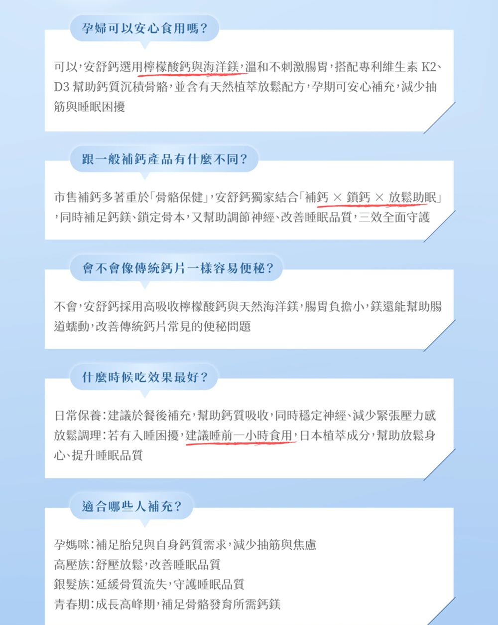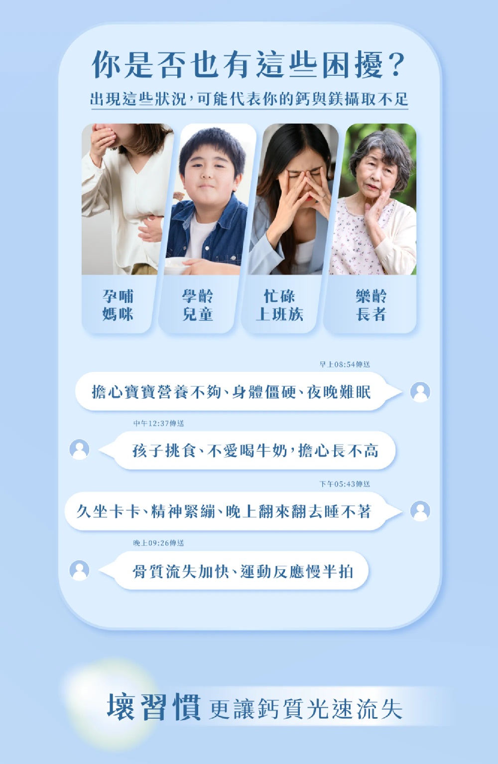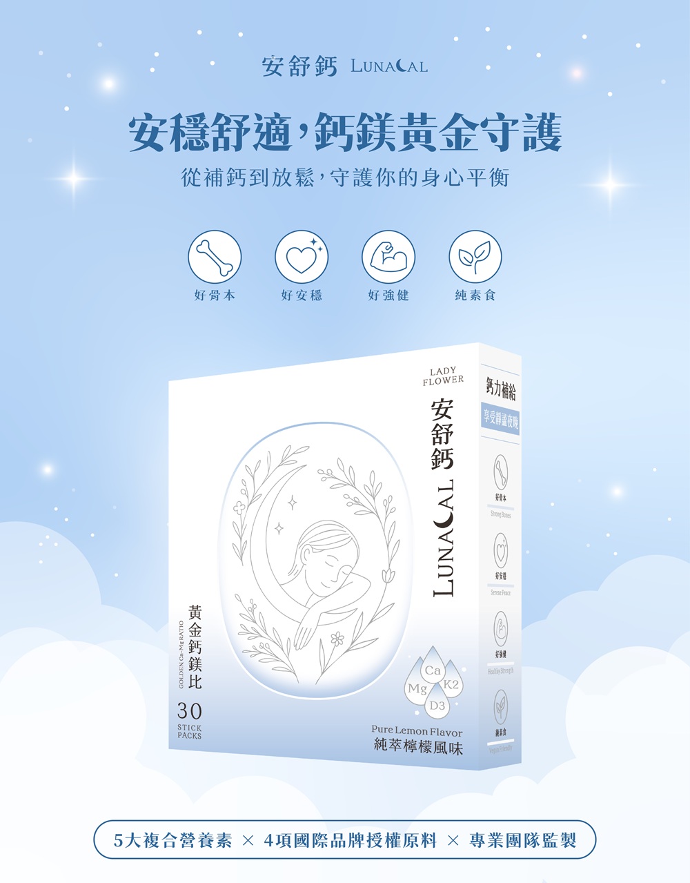 黃金鈣鎂比例2:1,溫和吸收 打造鎖鈣防護網 舒緩壓力,放鬆幫助入眠