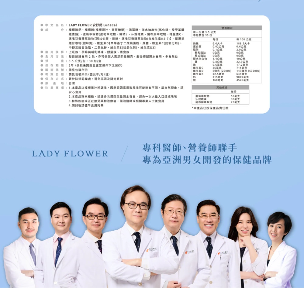 1.商品組合/規格:2盒組 2.商品品名:【LADY FLOWER】安舒鈣 黃金鈣鎂複合配方 30入/盒 3.商品重(容)量:30入/盒 4.內容物成分(如含有豬、牛成分請加註國別):如包裝說明 5.食品添加物名稱:無 6.原產地(國):台灣 7.製造廠商或國內負責廠商名稱:臺北醫學科技股份有限公司 8.製造廠商或國內負責廠商地址:台北市信義區信義路五段150巷2號10樓1005室 9.製造廠商或國內負責廠商電話:02-27226198 10.以消費者收受日算起,至少距有效日期前?日以上:270 11.食品業者登錄字號:A-182796575-00000-7 12.投保產品責任險字號:0524-25AML0001877