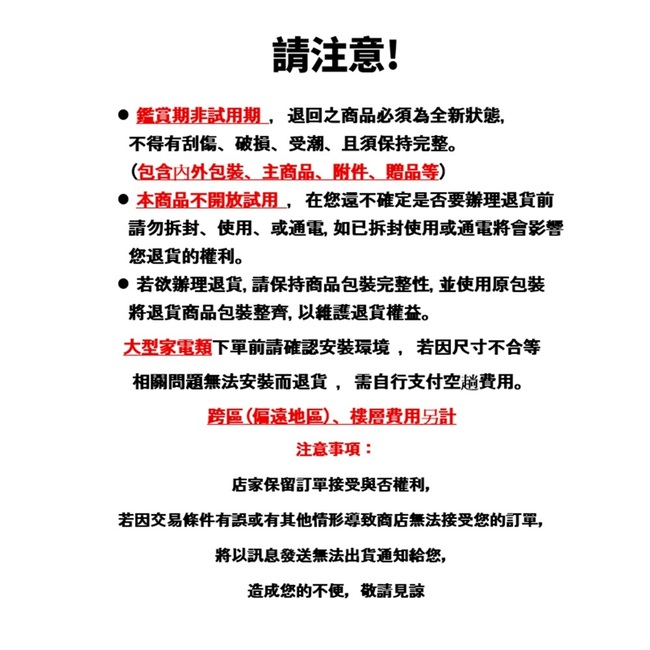 •保固:請依產品保固/說明書所刊載內容,在正常使用下保固期限1年,保固內維修請自行寄回維修,耗材品及人為因素使用錯誤導致商品毀損或故障,恕不在保固範圍內。(耗材品:燈管、扇葉、電線、濾網、內鍋…….等零配件)