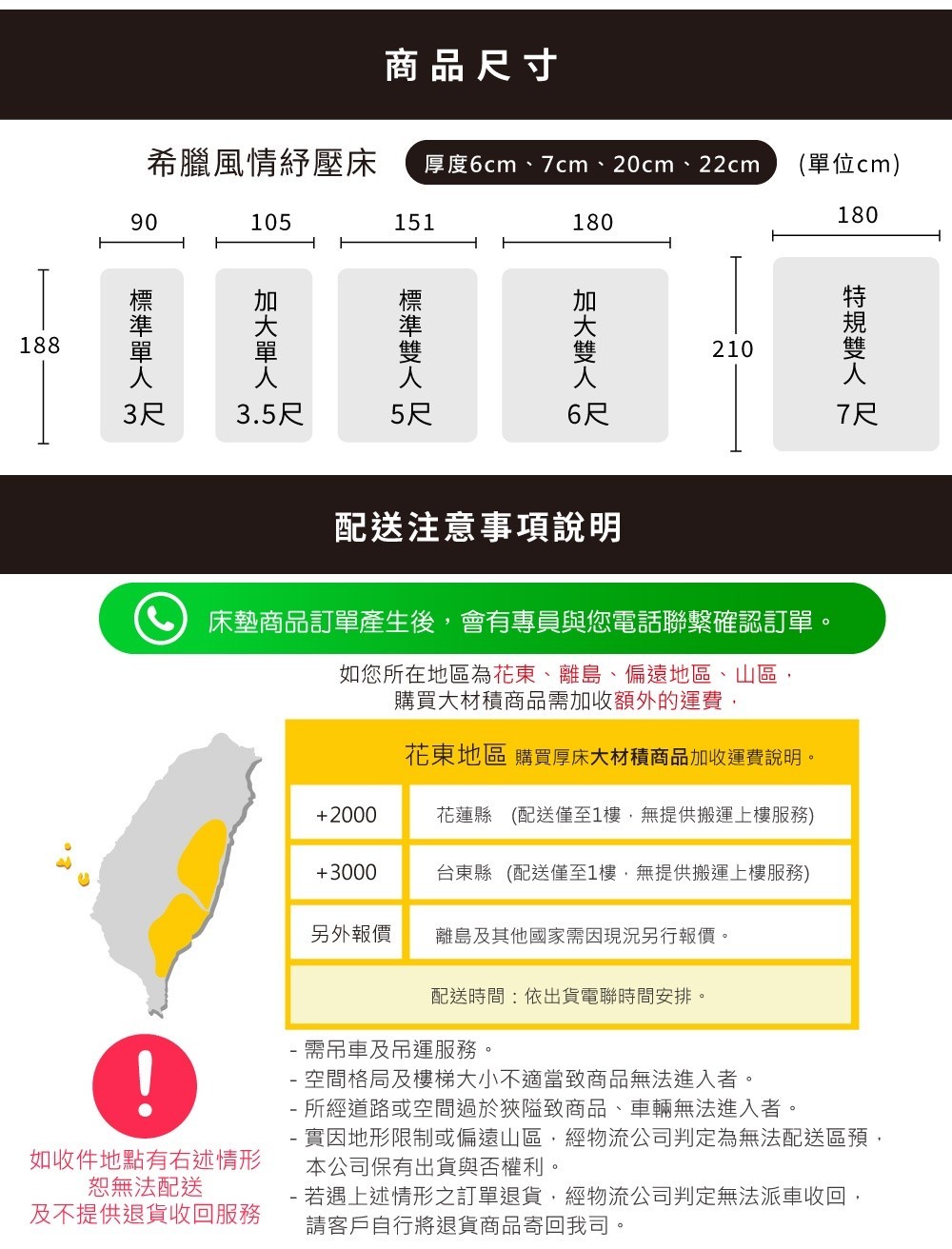 3尺床墊尺寸:188 X 105 X 7cm±2%