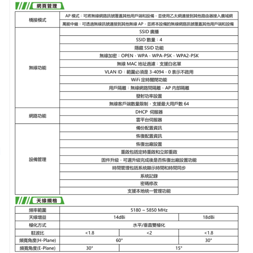 支持WLAN QoS功能、WMM協議、本地管理、自動功率調整、通道選擇及多項模式控制。