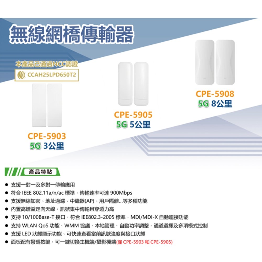 符合IEEE 802.11a/n/ac標準,傳輸速率可達900Mbps。