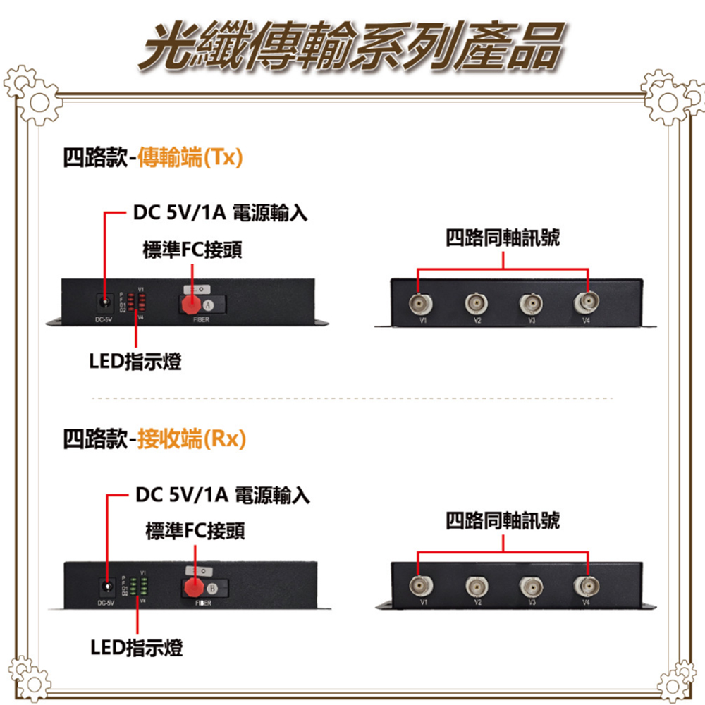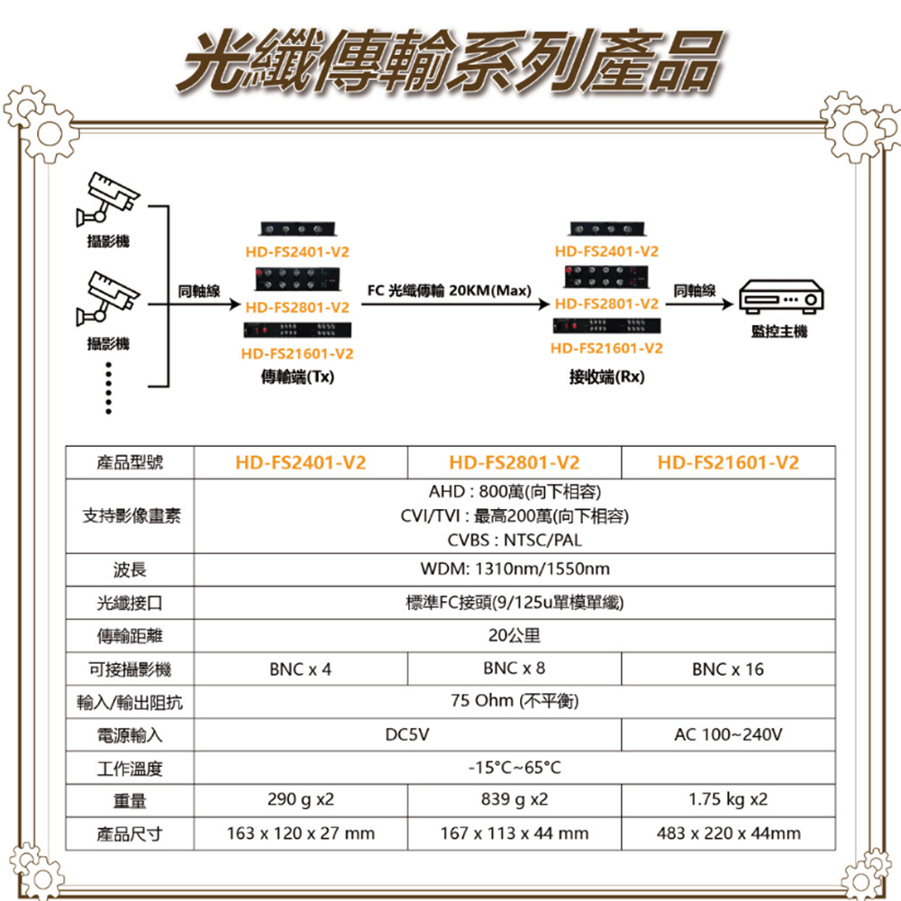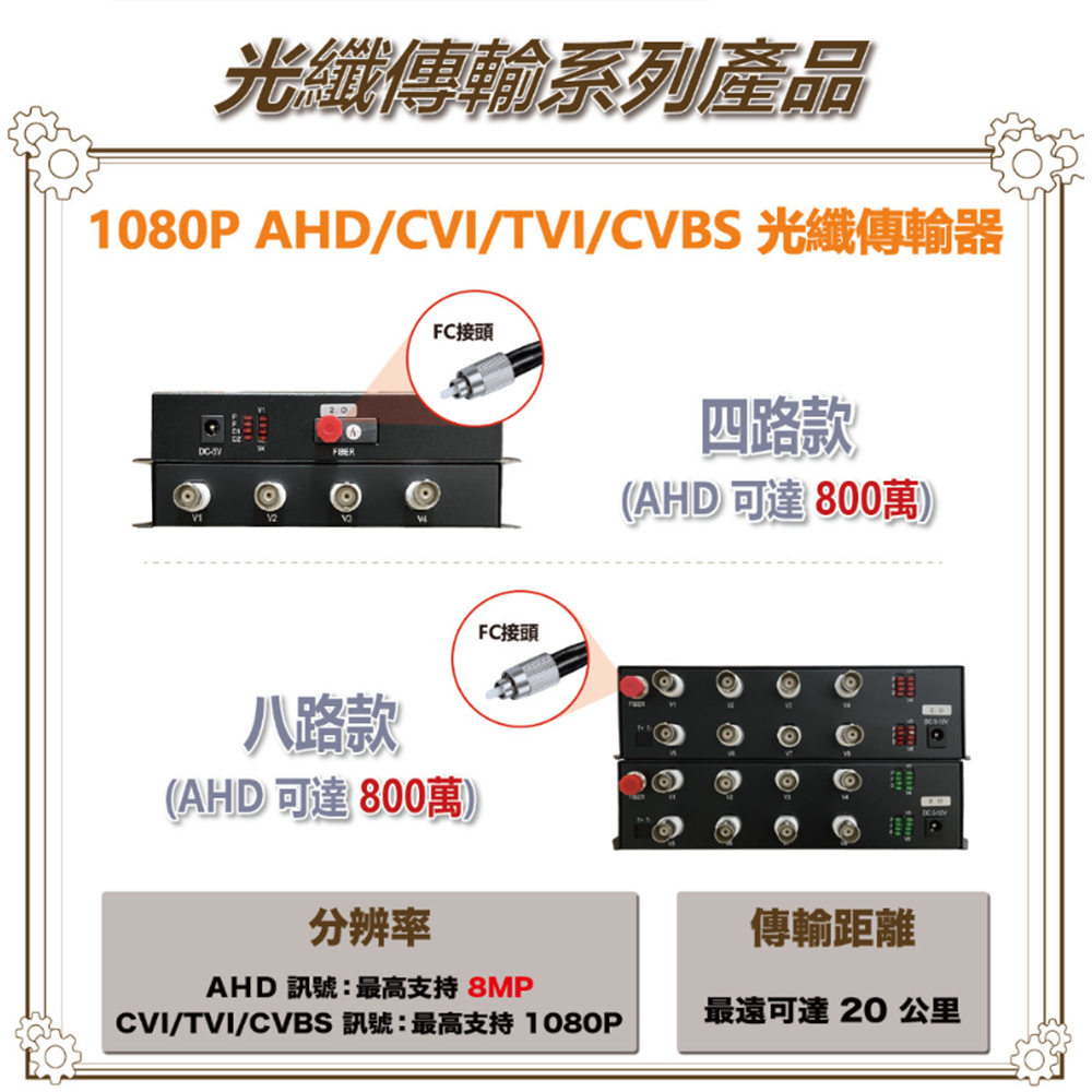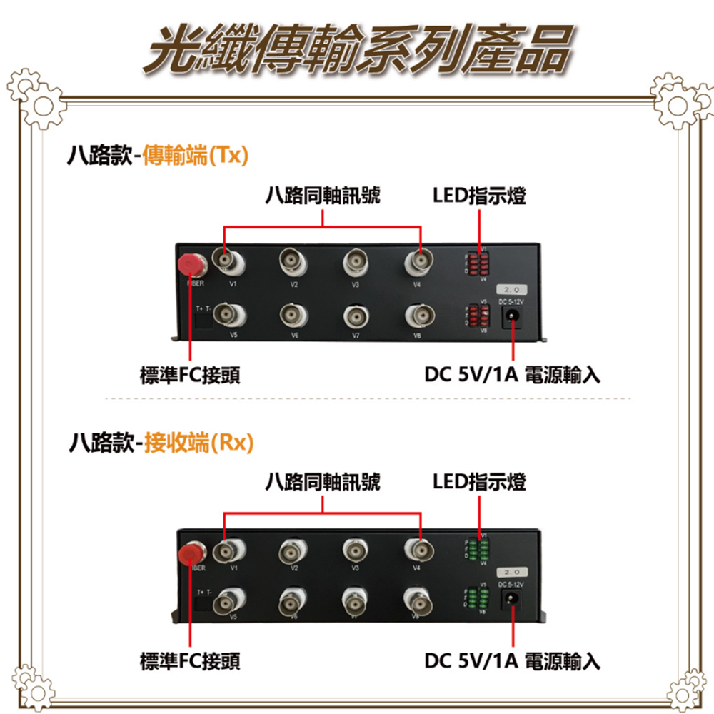 可傳輸 8 路 200 萬 同軸高清攝影機訊號。
