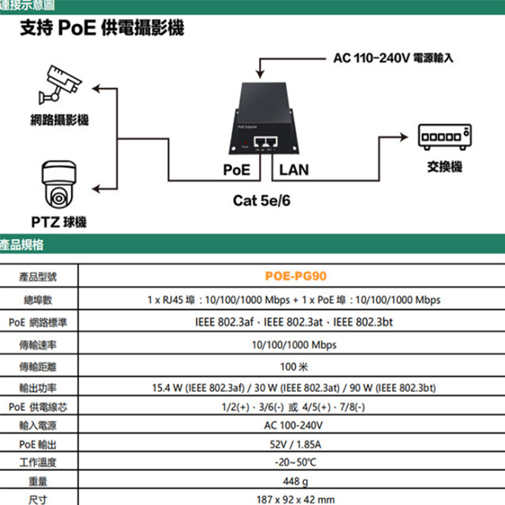 標準千兆網路傳輸,符合 IEEE 802.3af/at/bt 協議。