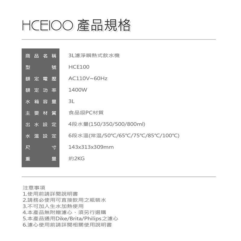 水溫設定:6段水溫(常温\50℃\65℃\75℃\85℃\100℃)
