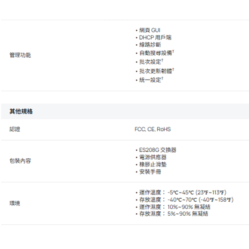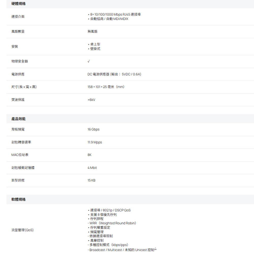 8× 10/100/1000Mbps RJ45 連接埠。