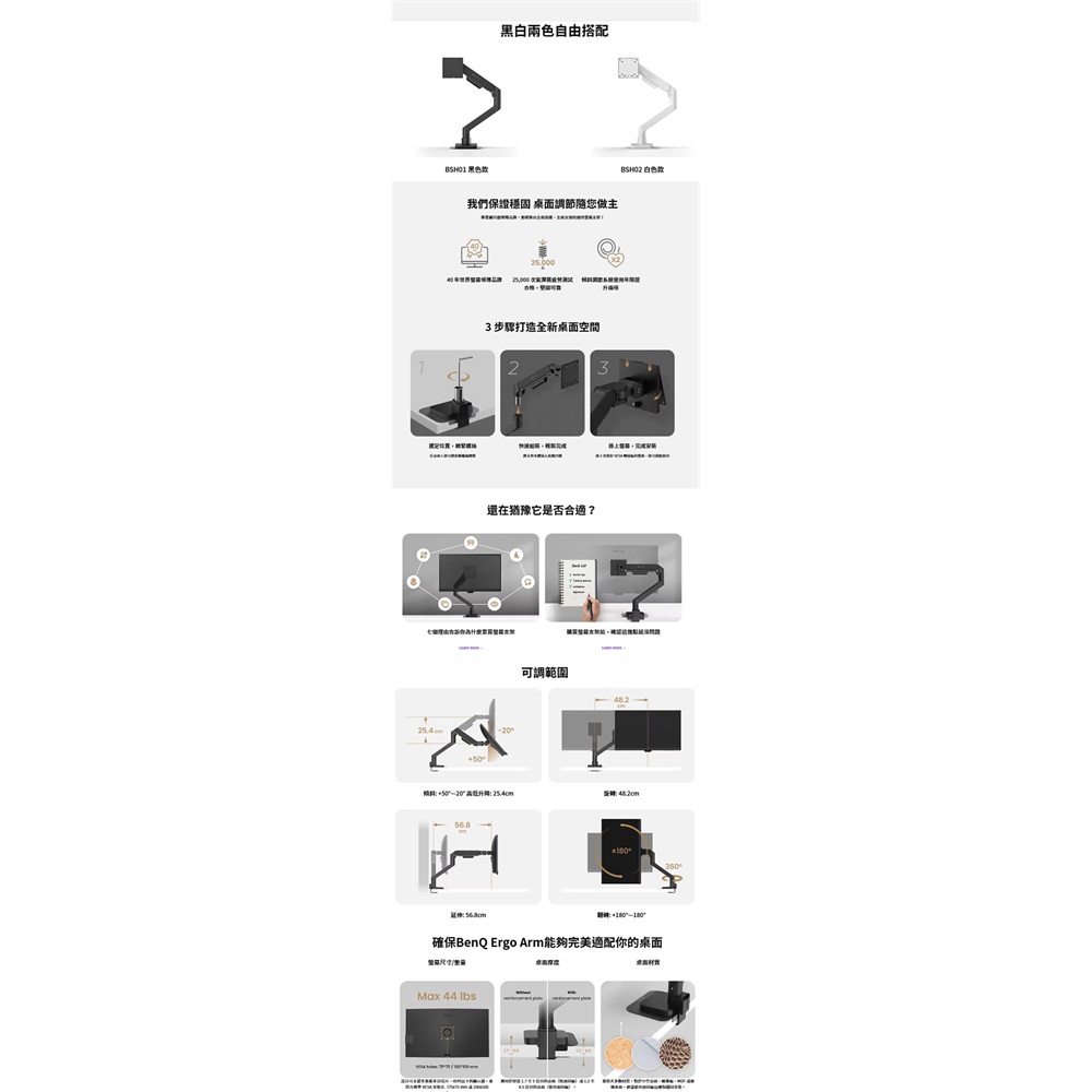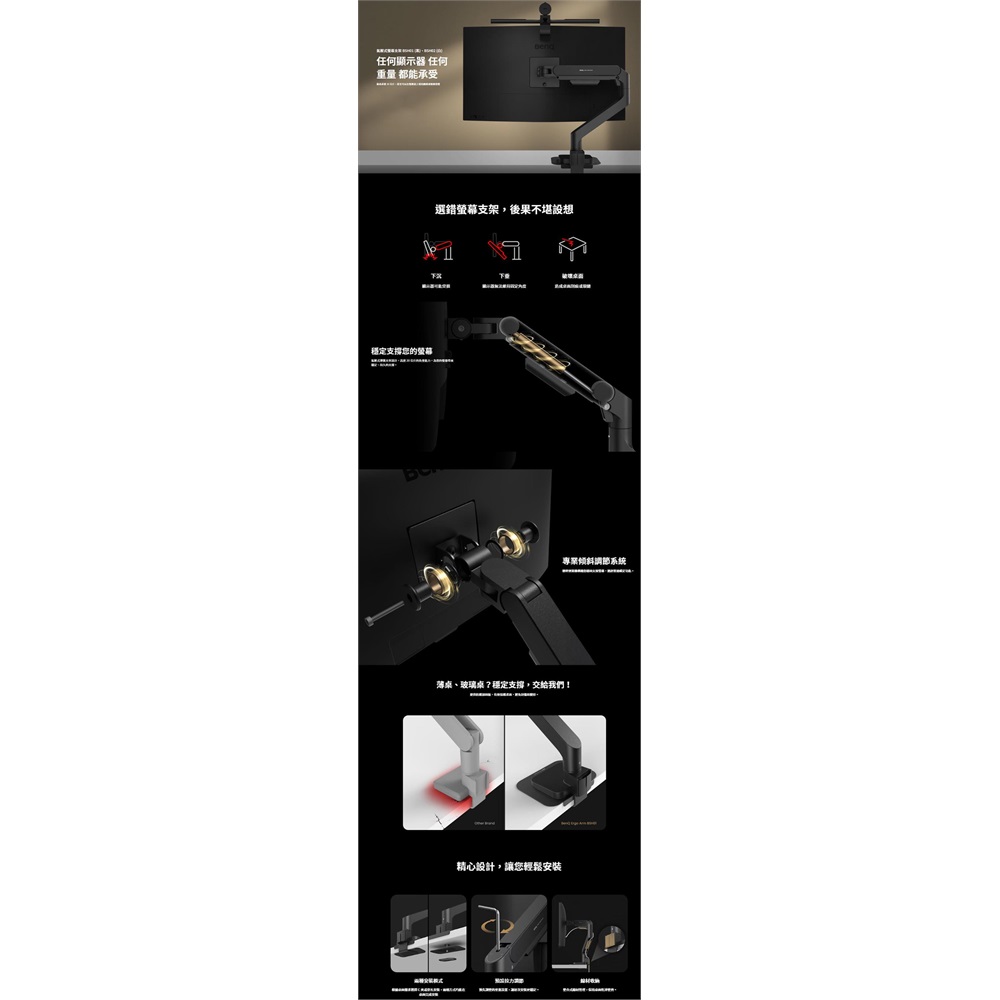 氣壓式彈簧支架設計, 高達 20 公斤的負重能力 專業傾斜調節系統 40年世界螢幕領導品牌 業界領先三年保固 市場唯一內附底座加固板 (價值 $500)