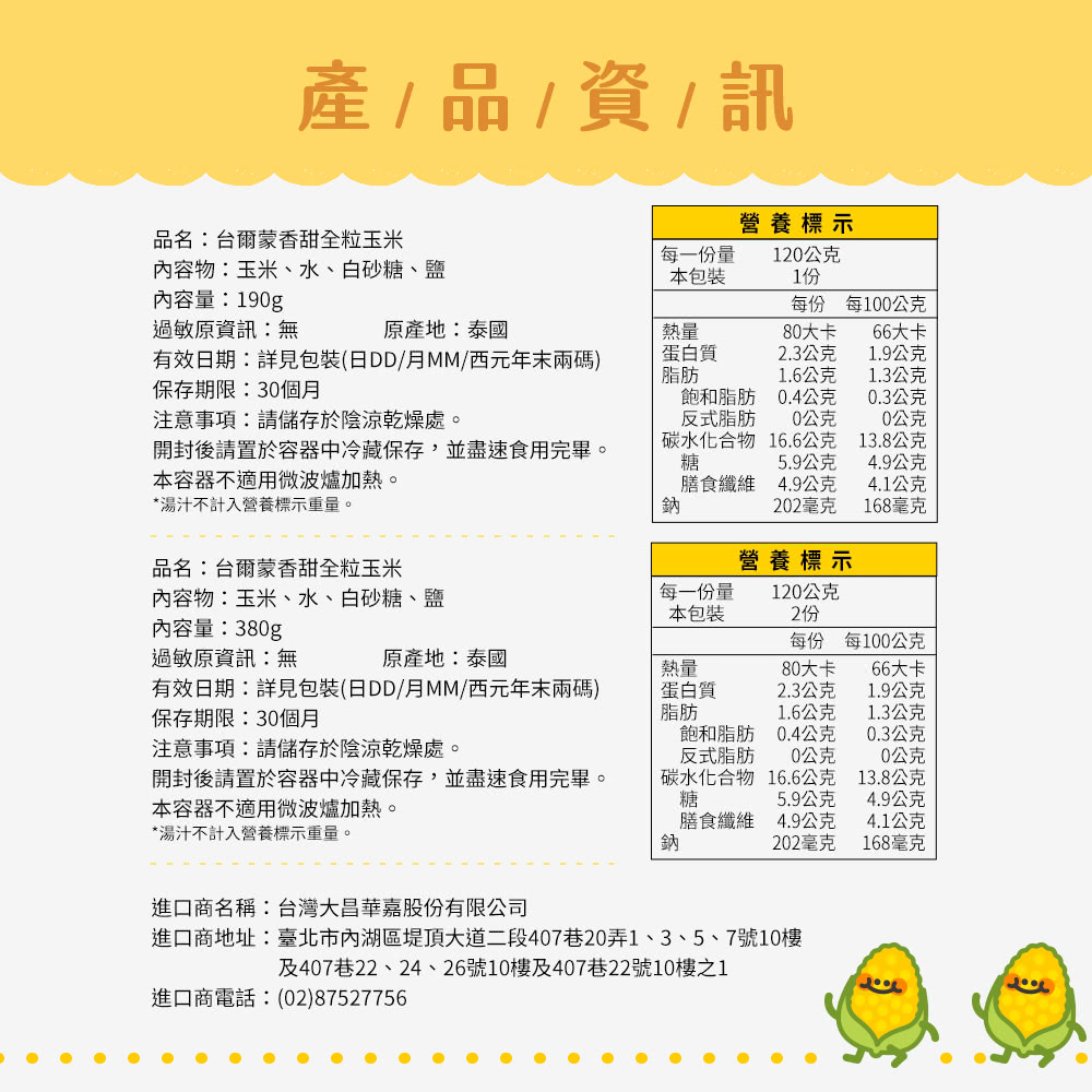 品名 / 台爾蒙 香甜全粒玉米(內容量380g固形物240g)