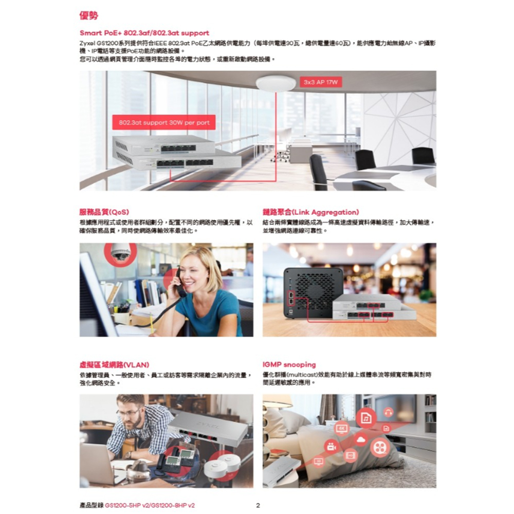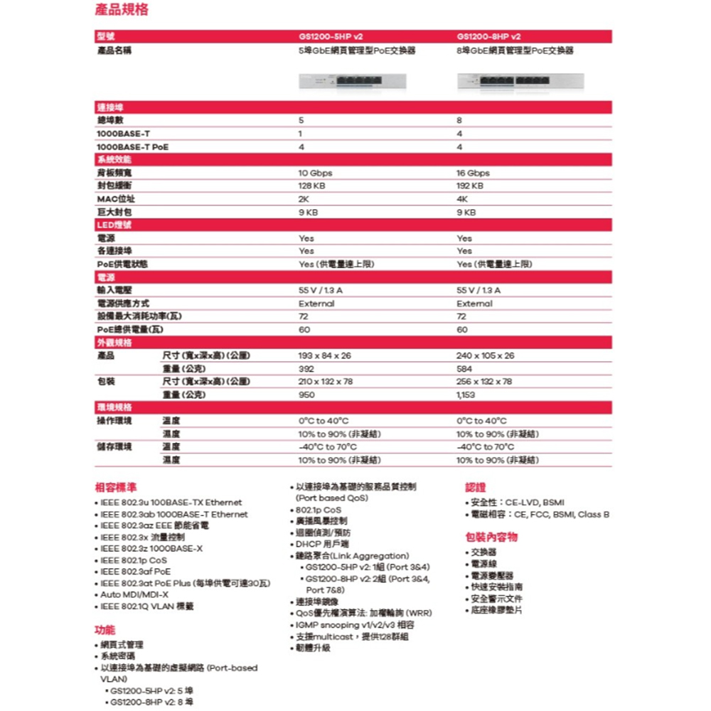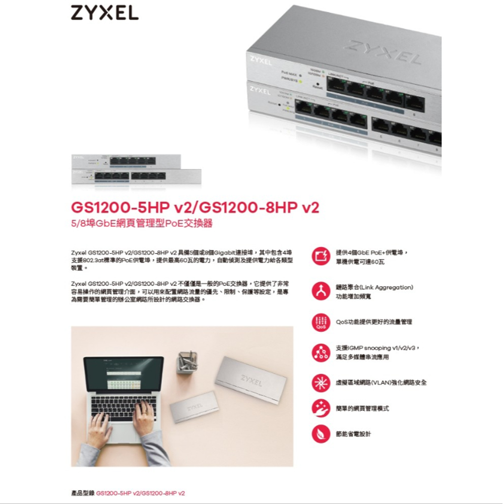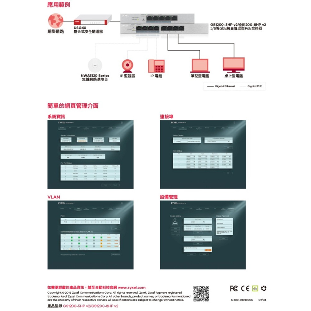 Zyxel GS1200-5HP v2/GS1200-8HP v2具備5個或8個Gigabit連接埠,其中包含4埠支援802.3at標準的PoE供電埠,提供最高60瓦的電力,自動偵測及提供電力給各類型裝置。