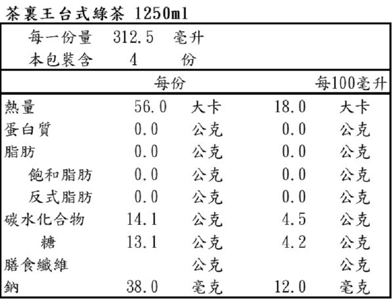 內容物(成分):水、蔗糖、茉莉綠茶、綠茶萃取液、青茶、香料、維生素C(抗氧化劑)、小蘇打、茶抽出物
