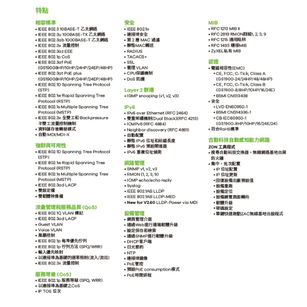 GS1900系列擁有許多進階功能,包含:VLAN(用於隔離公共網路和私人網路),QoS(優化頻寬管理),IGMP snooping,鏈路聚合(LAG),IPv6和DoS防護等,使得網路流量能被區分並優化。