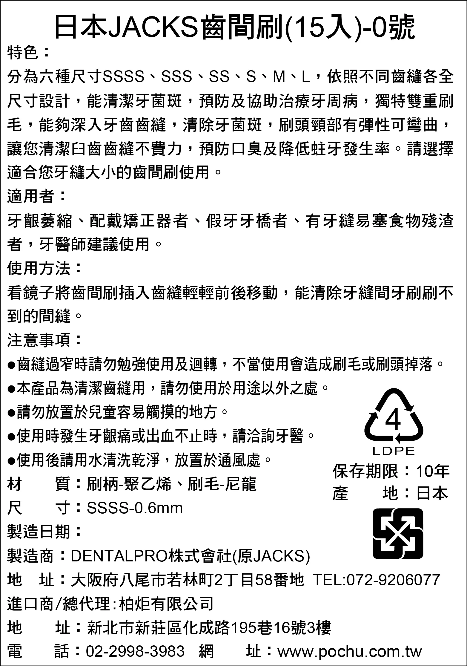 - 使用方法:看鏡子將齒間刷插入齒縫輕輕前後移動,能清除牙縫間牙刷刷不到的間隙。