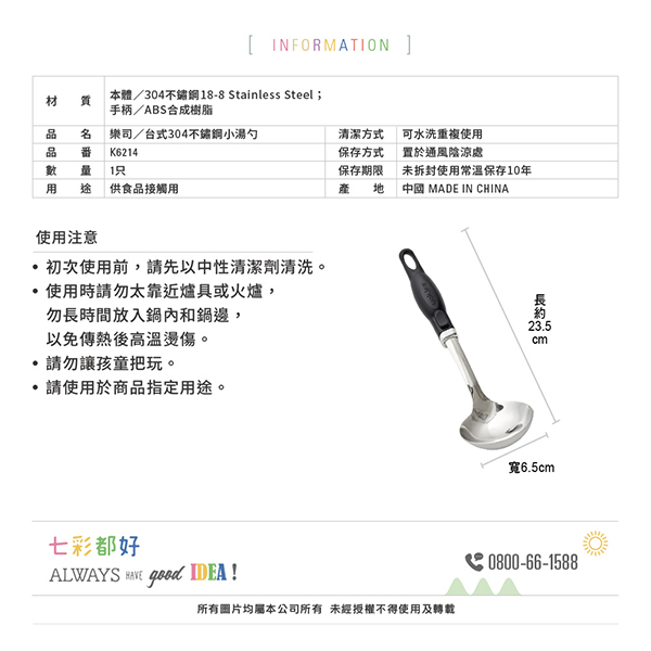 商品尺寸: 約長23.5x寬6.5cm 商品材質 :本體/304不鏽鋼18-8 Stainless Steel;手柄/ABS合成樹脂 原產地(國):中國◎ 製造日期與有效期限,商品成分皆標示於包裝盒上 ◎ 本產品網頁因拍攝關係,圖檔略有差異,實際以廠商出貨為主 ◎ 本產品文案若有變動敬請參照實際商品為準
