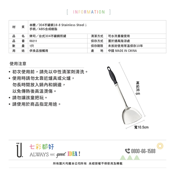 商品尺寸: 約長36x寬10.5cm 商品材質 :本體/304不鏽鋼18-8 Stainless Steel;手柄/ABS合成樹脂 原產地(國):中國◎ 製造日期與有效期限,商品成分皆標示於包裝盒上 ◎ 本產品網頁因拍攝關係,圖檔略有差異,實際以廠商出貨為主 ◎ 本產品文案若有變動敬請參照實際商品為準