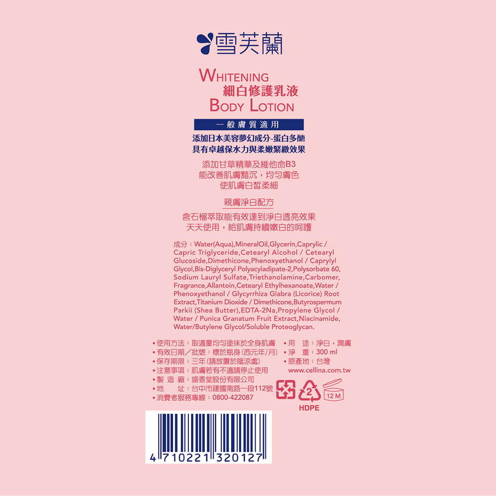 www.cellina.con.tw◎ 製造日期與有效期限,商品成分皆標示於包裝盒上