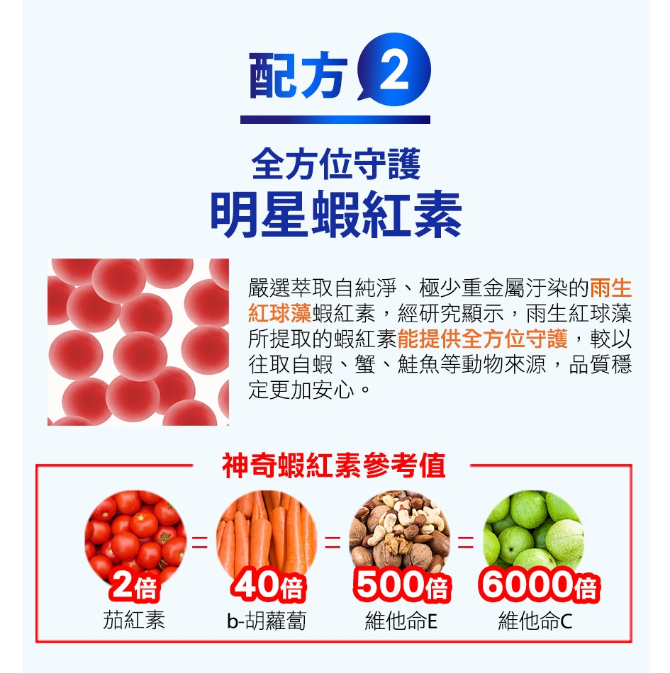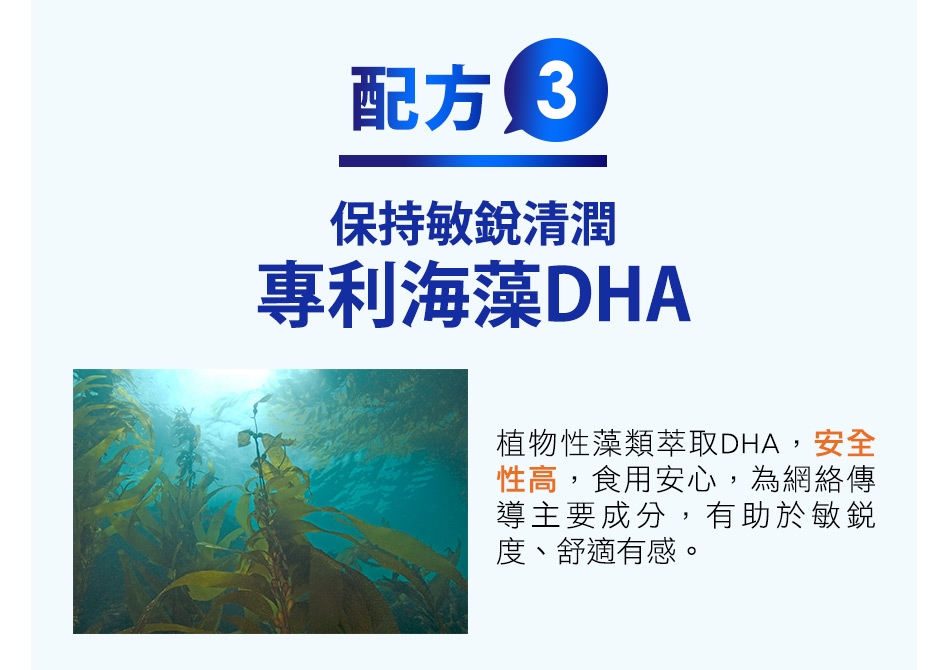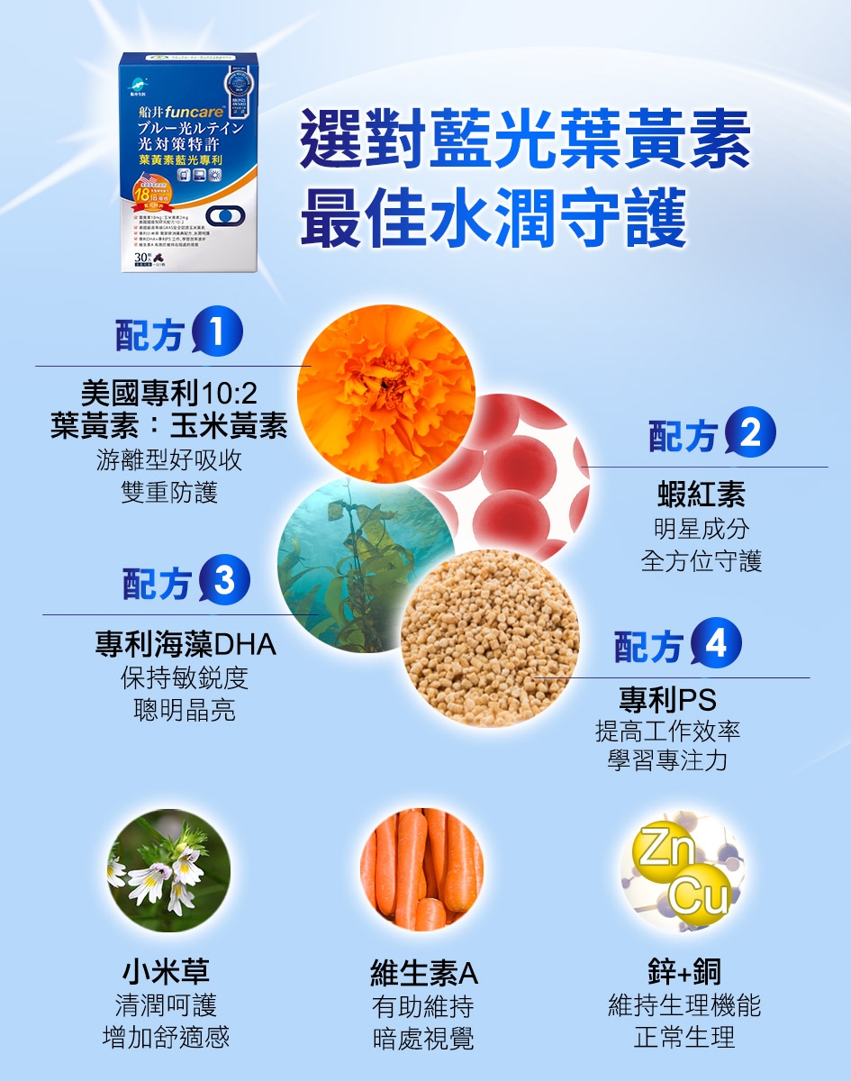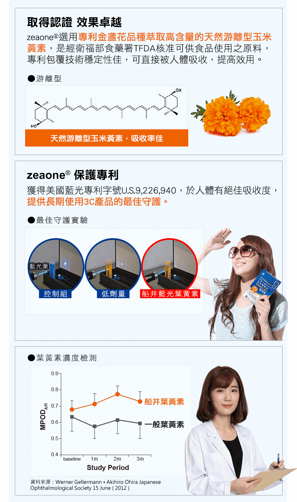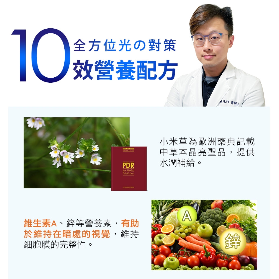 成分:小米草萃取、葉黃素20%(金盞花萃取)、金盞花萃取(含專利zeaone玉米黃素藍光專利:US9226940)、葡萄糖酸鋅、美國專利藻類萃取(含DHA)、葡萄糖酸銅、專利磷脂質絲胺酸(PS)、硬脂酸鎂、二氧化矽、雨生紅球藻(含蝦紅素)、維生素A 膠囊成分:羥丙基甲基纖維素、純水、鹿角菜膠、二氧化鈦、食用紅色七號、氯化鉀、食用黃色四號、食用藍色一號
