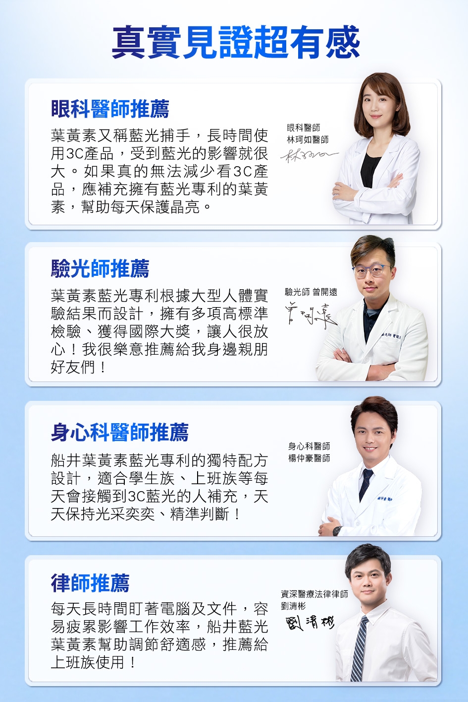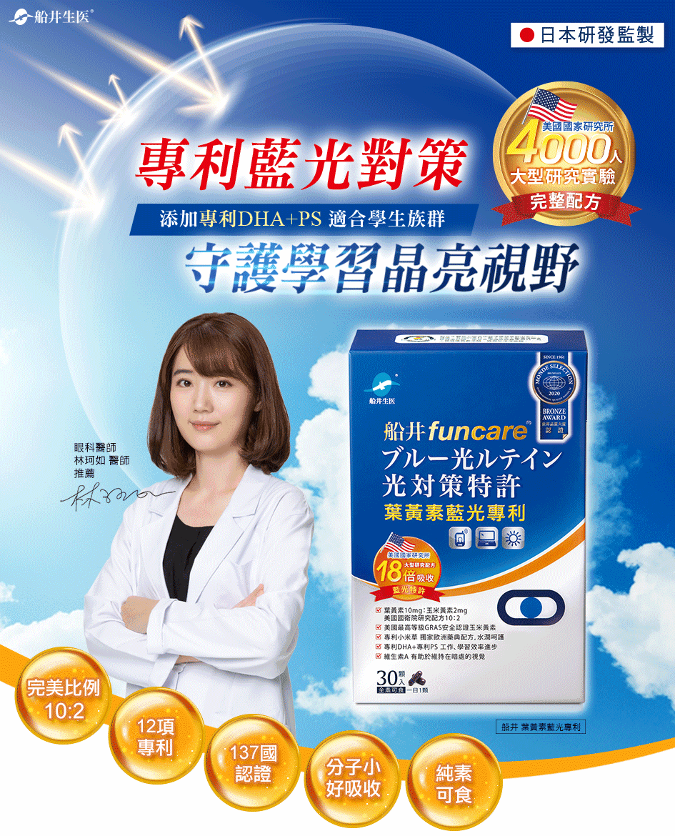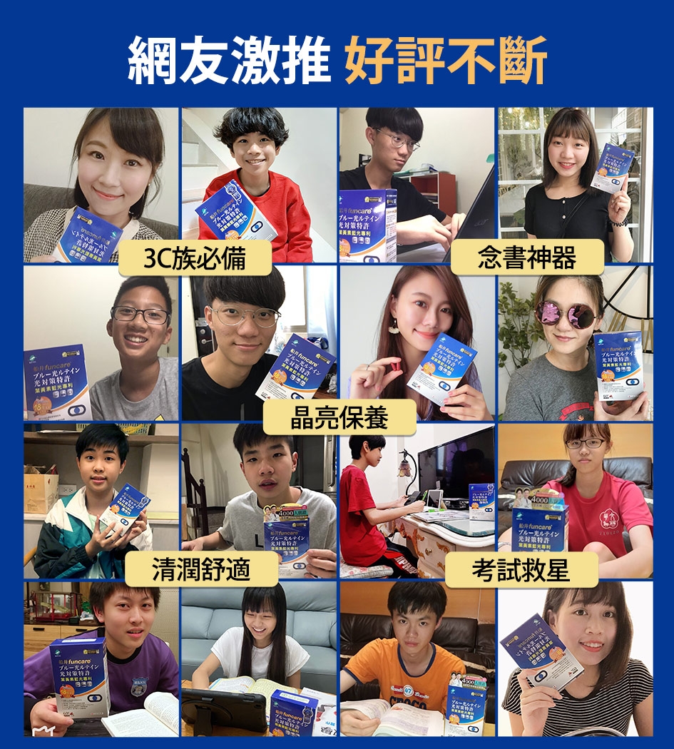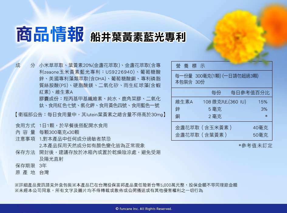 成分:小米草萃取、葉黃素20%(金盞花萃取)、金盞花萃取(含專利zeaone玉米黃素藍光專利:US9226940)、葡萄糖酸鋅、美國專利藻類萃取(含DHA)、葡萄糖酸銅、專利磷脂質絲胺酸(PS)、硬脂酸鎂、二氧化矽、雨生紅球藻(含蝦紅素)、維生素A 膠囊成分:羥丙基甲基纖維素、純水、鹿角菜膠、二氧化鈦、食用紅色七號、氯化鉀、食用黃色四號、食用藍色一號