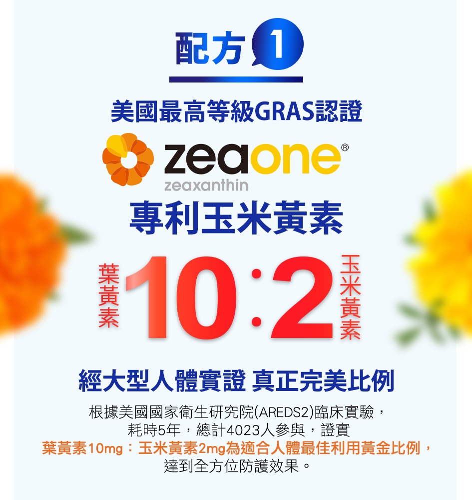 ◆葉黃素:玉米黃素 美國國衛院研究比例10mg:2mg