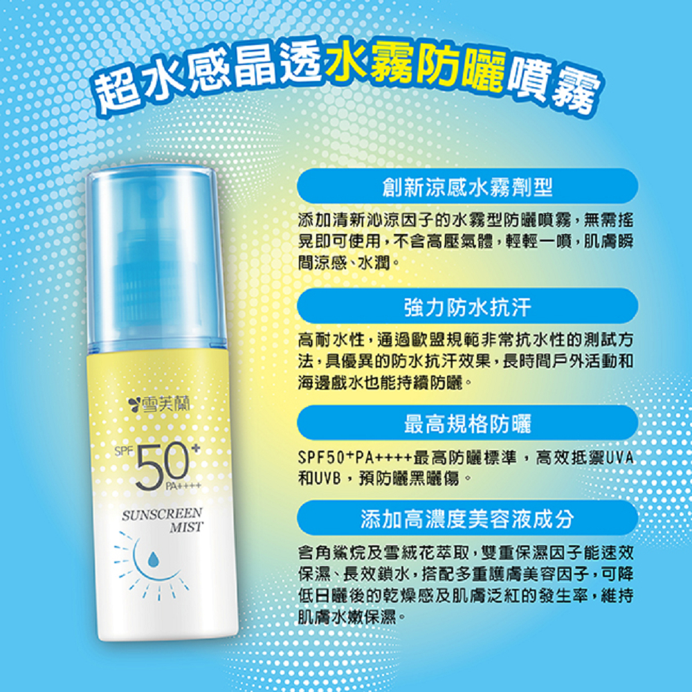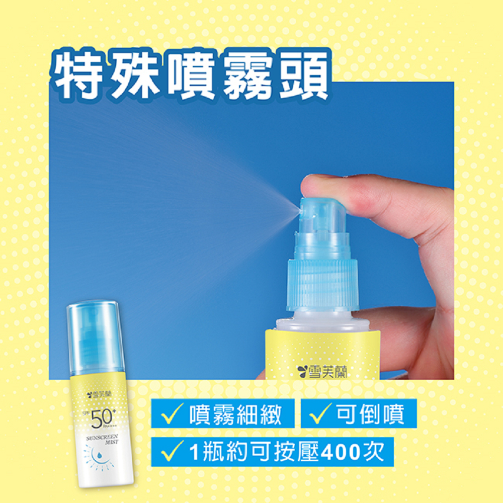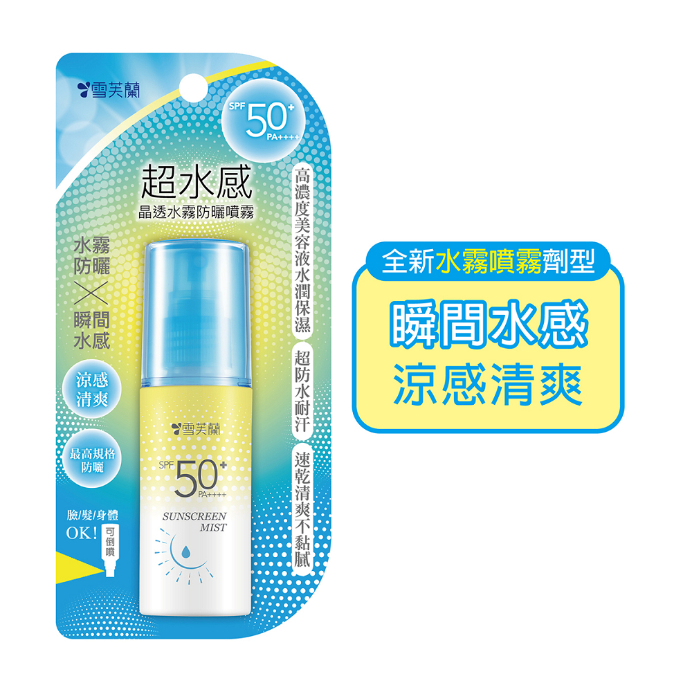 添加清新沁涼因子的水霧型防曬噴霧,無需搖晃即可使用,不含高壓氣體,隨時隨地安心使用。輕輕一噴,肌膚瞬間涼感、水潤,快速啟動抗曬防禦機制,頸後、背部、腳背、頭髮,也能輕鬆防曬。獨家防曬薄膜劑型,服貼肌膚且速乾清爽不黏膩,快速形成肌膚隱形保護膜,持續發揮UV防禦效果,維持一整天清透舒適。