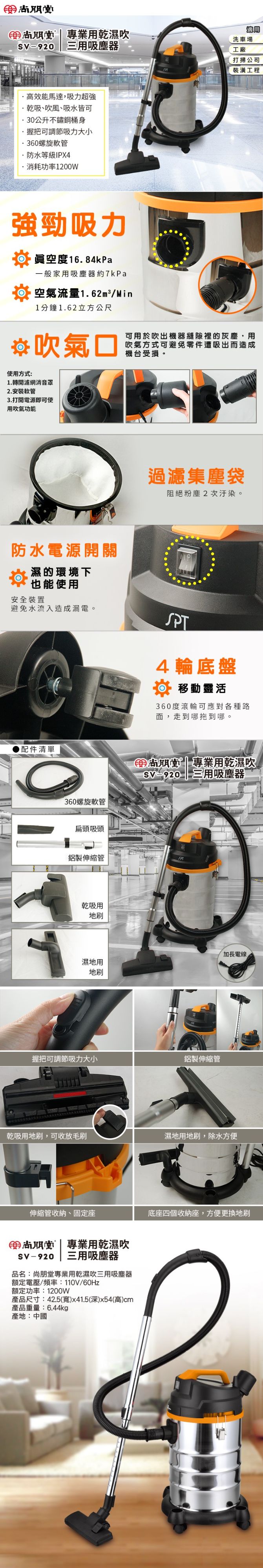 1.高效能馬達,吸力超強 2.乾吸、吹風、吸水皆可 3.30公升不鏽鋼桶身 4.握把可調節吸力大小 5. 360螺旋軟管 6.採用鋁製伸縮管 7.工廠、家庭、營業皆適用