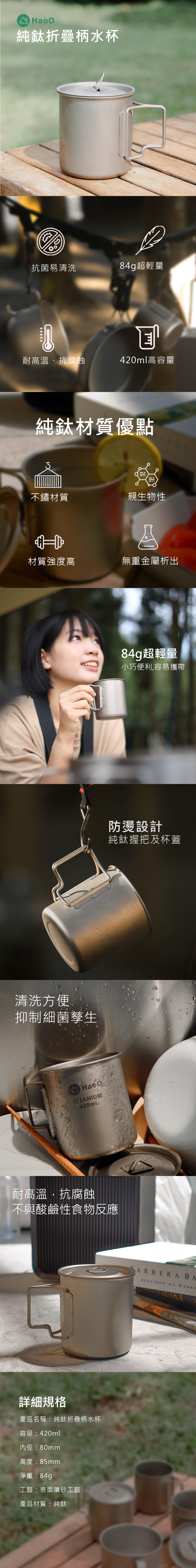 【露營野炊神器】純鈦折疊柄水杯 。 420ml超輕量僅重84g攜帶無負擔 。 純鈦握把及杯蓋 。 折疊握把設計,裝水不燙手 。 抑制細菌孳生 。 耐高溫、抗腐蝕性,不與酸鹼性食物反應