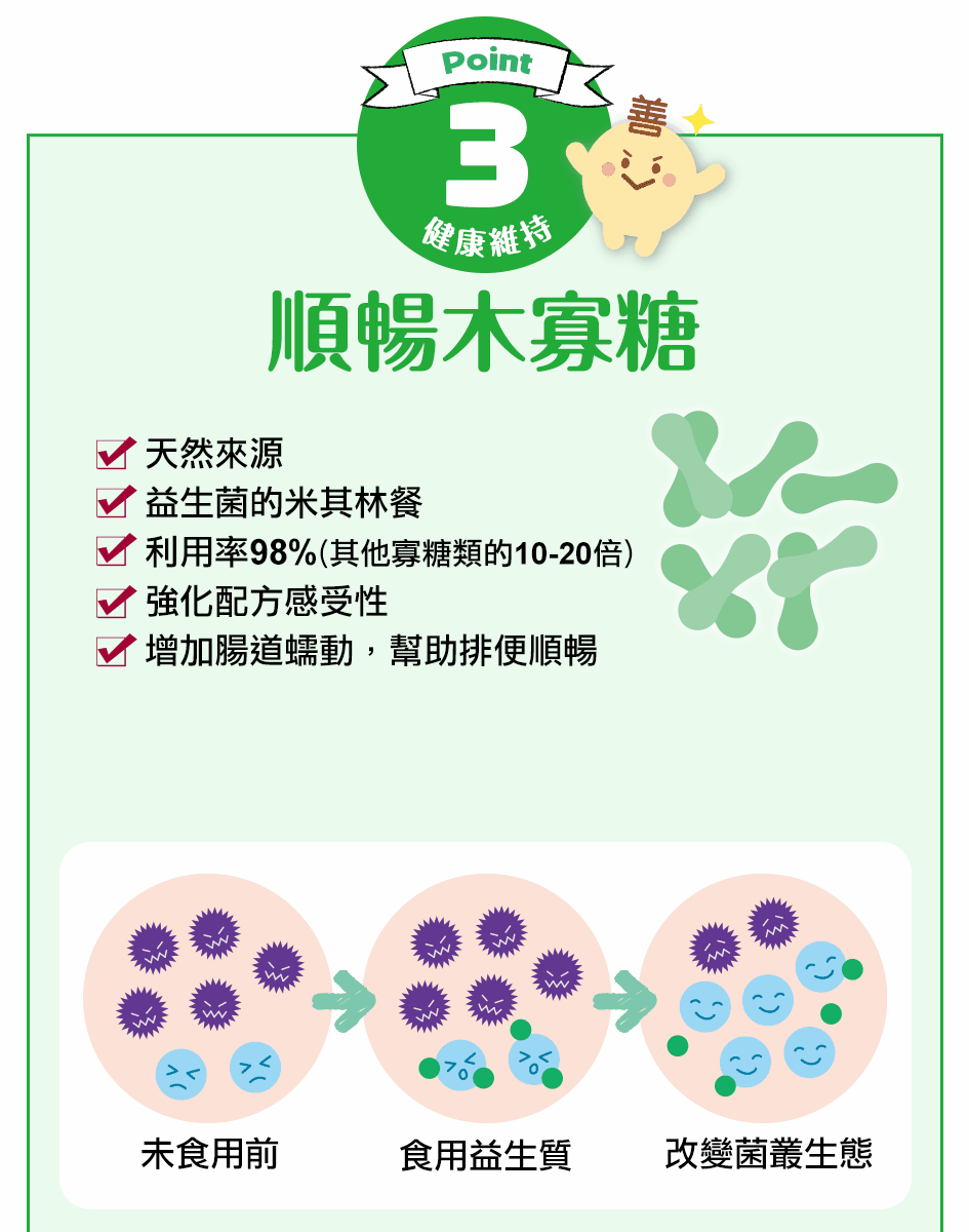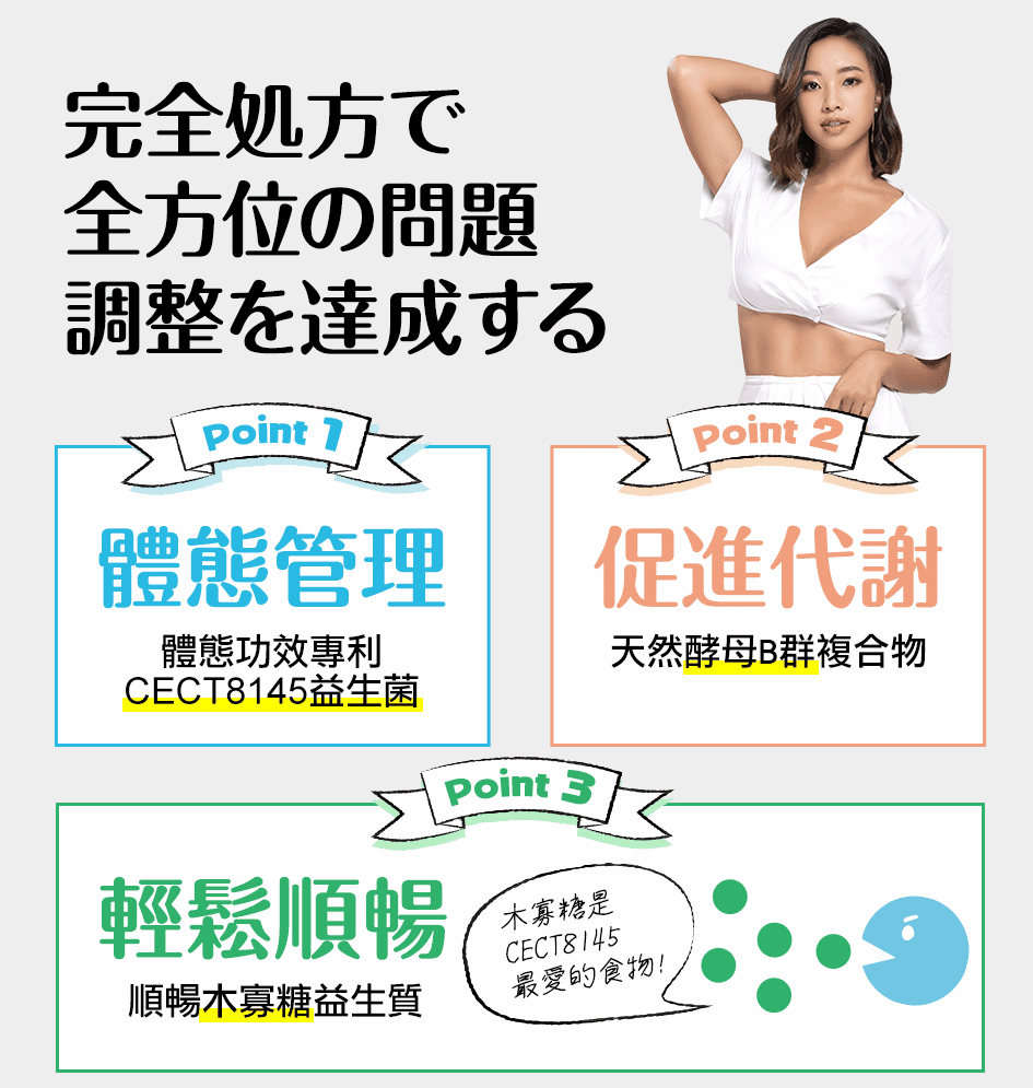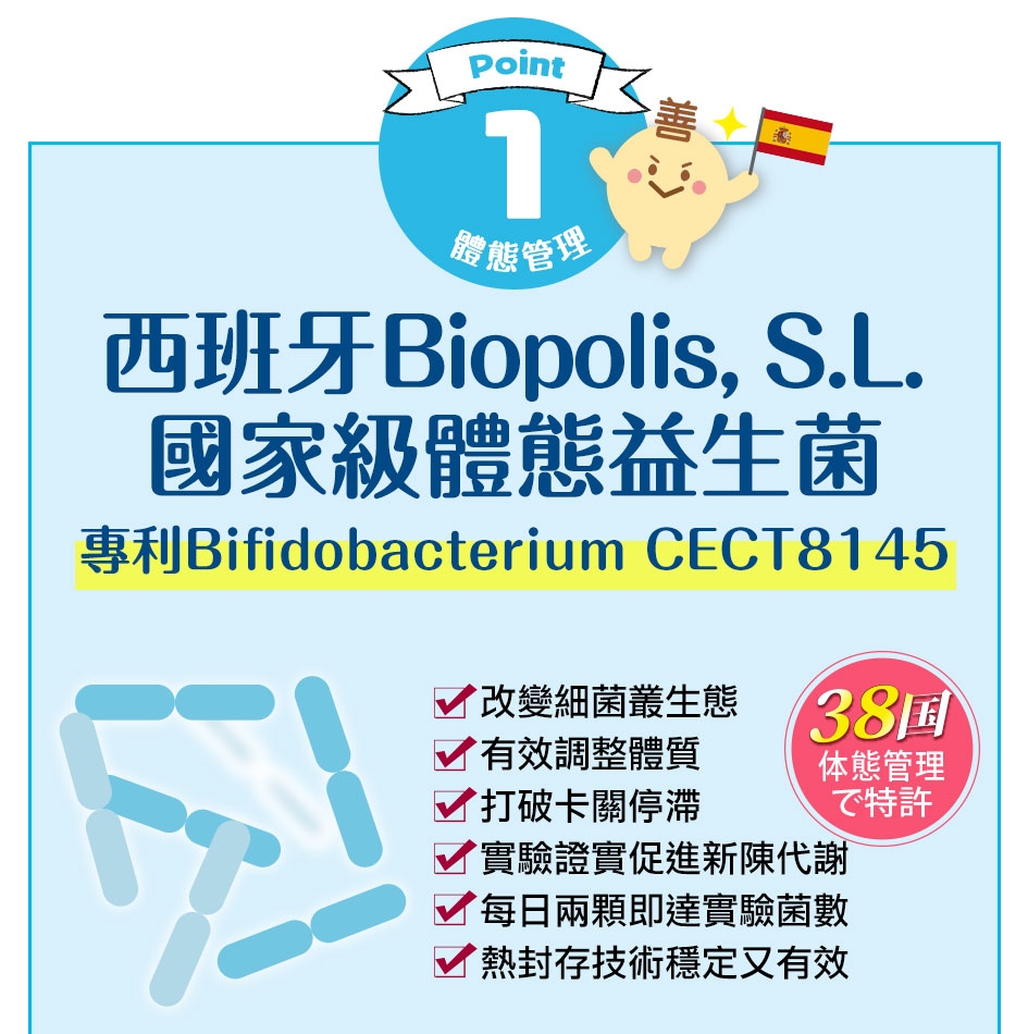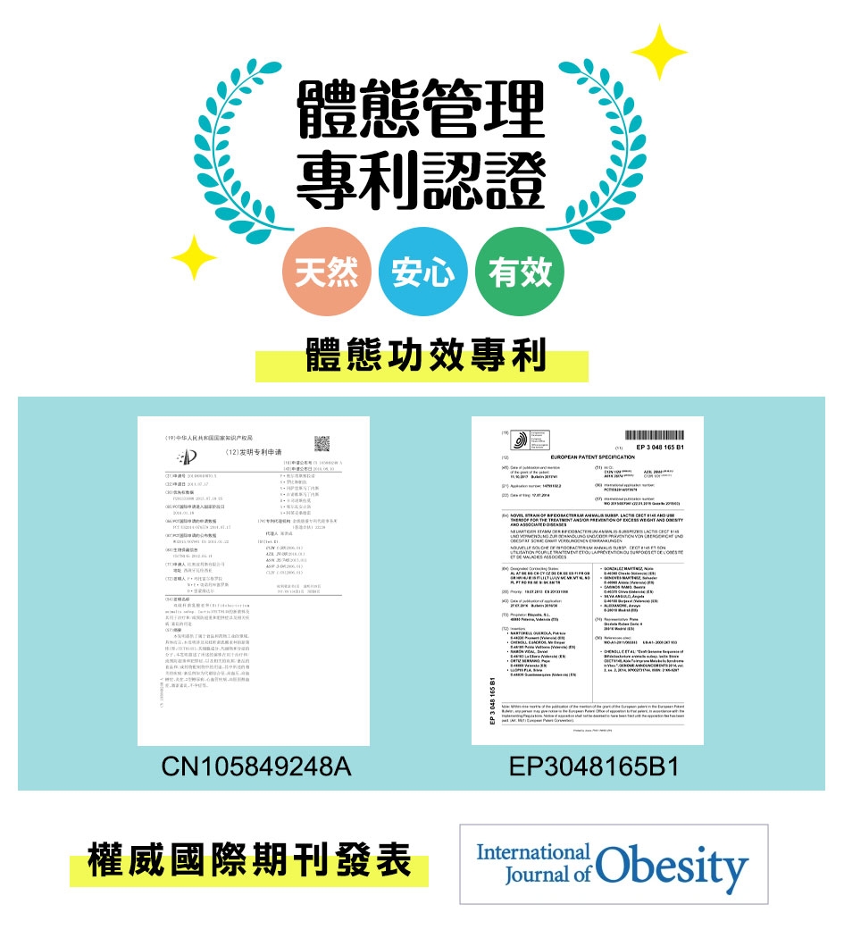 ●國際A.A. Clean Label 無添加驗證 ●雙體態管理專利+雙安全認證益生菌 ●耐胃酸耐膽鹽,順利到達腸道 ●營養好吸收、幫助能量代謝 ●打造健康腸道環境、輕盈更有感 ●孕哺媽咪安心可食,養胎不養肉