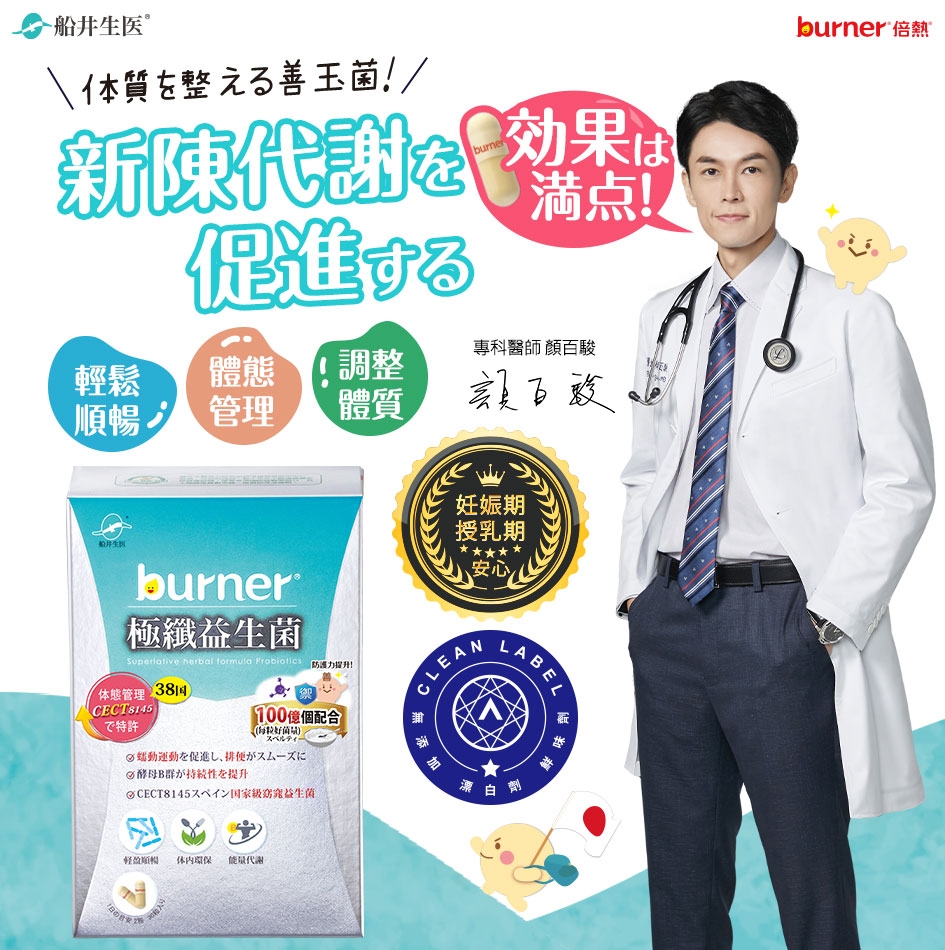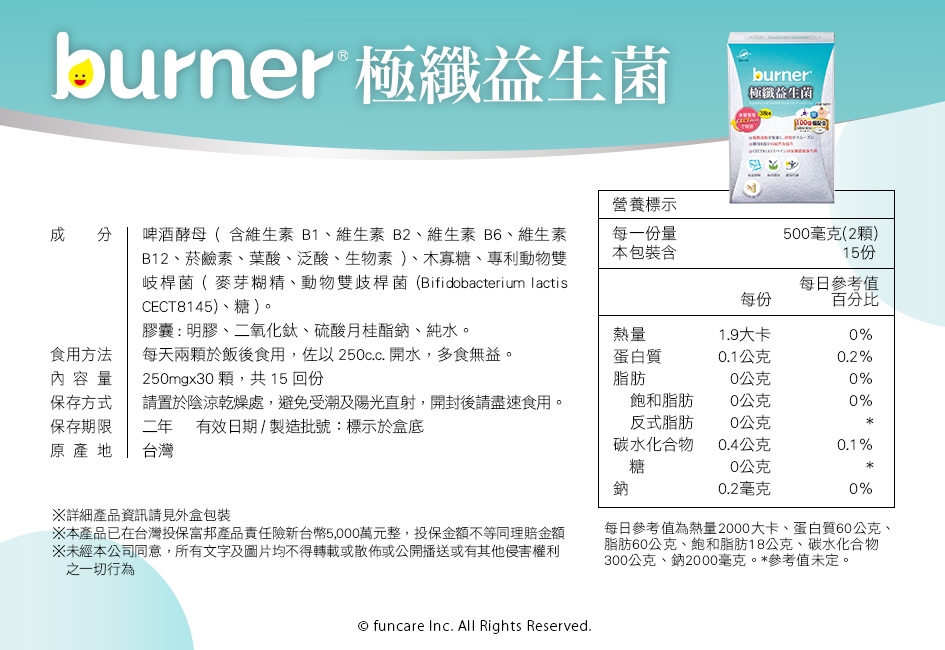 品名:船井®burner®倍熱®極纖益生菌 成分:啤酒酵母(含維生素B1、維生素B2、維生素B6、維生素B12、菸鹼素、葉酸、泛酸、生物素)、木寡糖、專利乳酸菌(麥芽糊精、雙歧桿菌(Bifidobacterium lactis CECT8145)、糖) 膠囊: 明膠、二氧化鈦、硫酸月桂酯鈉、純水 食用方法:每天兩顆於飯後食用,佐以250c.c.開水,多食無益 內容量:250mg X 30顆,共15回份 保存方式﹕請置於陰涼乾燥處,避免受潮及陽光直射,開封後請盡速食用 保存期限:二年 有效日期/製造批號:標示於盒底 原產地:台灣 ◆本品已在台灣投保富邦產品責任險新台幣5,000萬元整,理賠金額不等同於投保金額。 ◆本組合不開放體驗,詳細產品資訊請見外盒包裝,產品包裝如有異動,請以實際收到之產品為準。 ◆未經本公司同意,所有文字及圖片均不得轉載或散佈或公開播送或有其他侵害權利之一切行為。 ◆退貨條件: 除商品本身有瑕疵可辦理退貨,商品一經拆封使用或損毀即不可退貨,退貨必須保留商品組合及贈品之齊全及完整性。