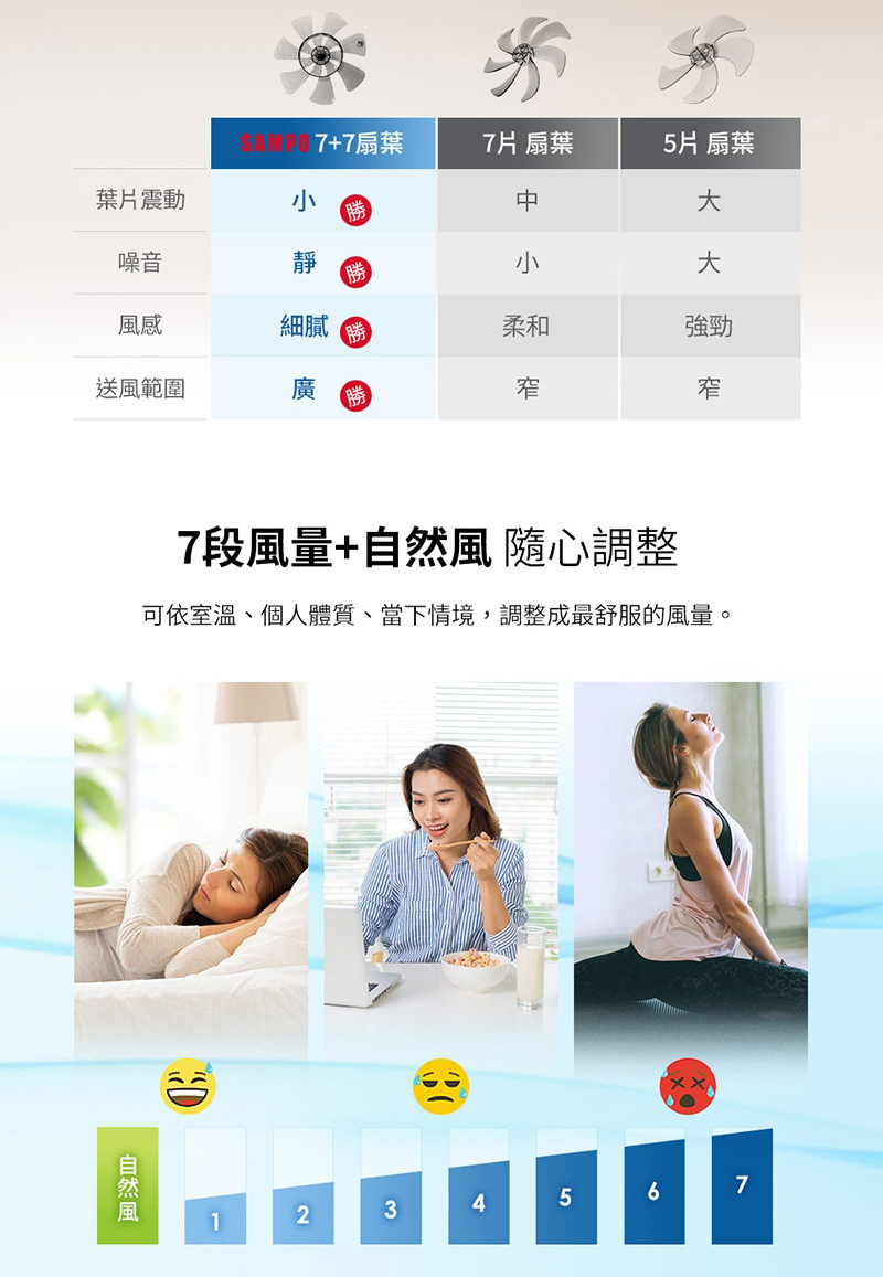 (6) 7段+自然風速選擇、1~9小時定時開、關機設計