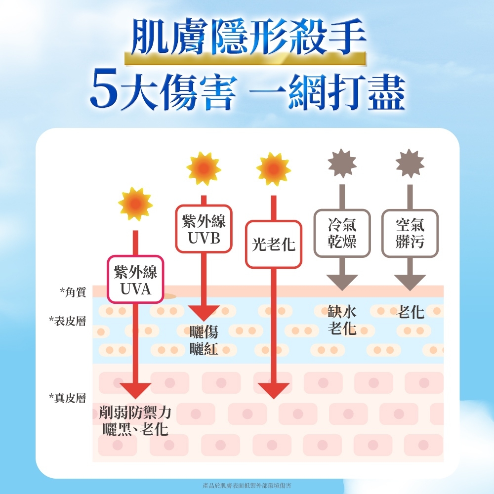 2. 5重防護配方,有效抵禦UVA、UVB、空氣髒污、光老化與冷氣乾燥,全面打擊5大肌膚傷害。