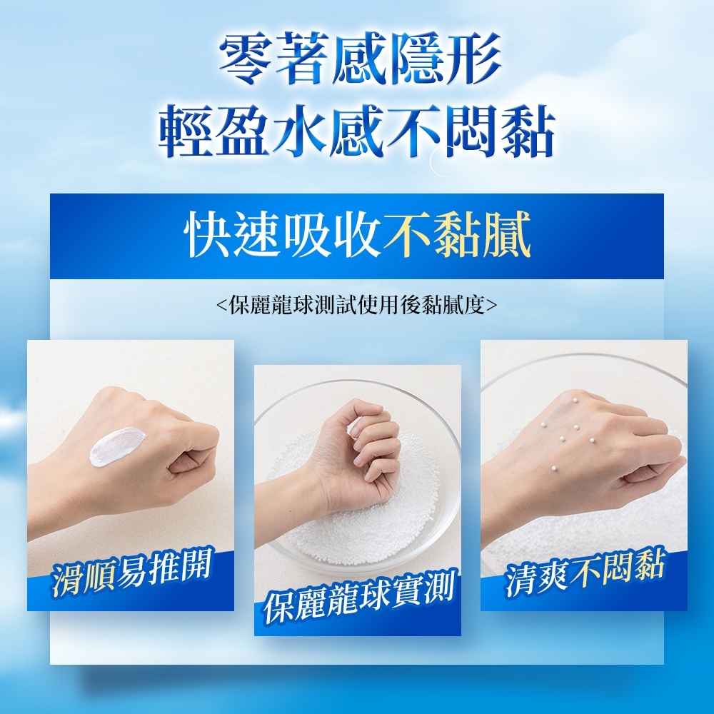 3. 零著感隱形科技,特選水油雙相防曬成份,滑順易推開,快速吸收不泛白、輕盈水感不悶黏
