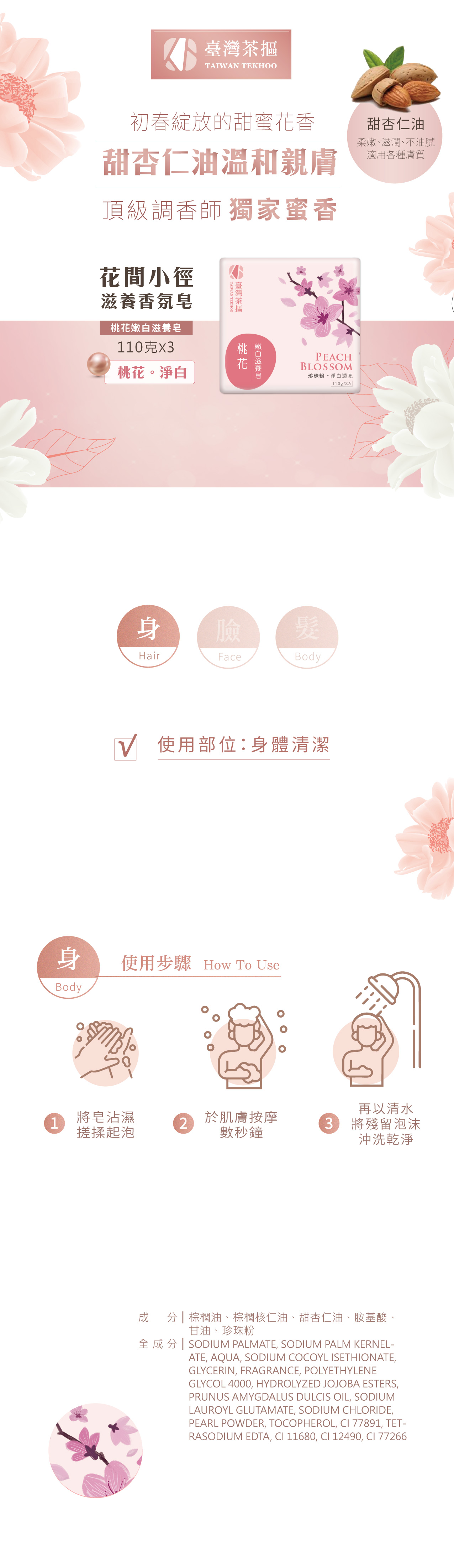 親膚的甜杏仁油,質地溫和,具有滋潤肌膚的功效 搭配美容珍珠粉,使肌膚淨白柔嫩