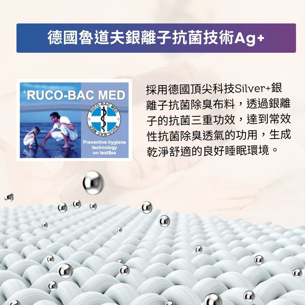 床包面料採用德國魯道夫銀離子抗菌技術,能殺死600多種細菌,有效抑止細菌滋生,三重功效阻止細菌生存,給您提供更健康、更安全的睡眠品質。 允許銀離子直接與皮膚接觸,確保您和家人安心遠離細菌和異味。