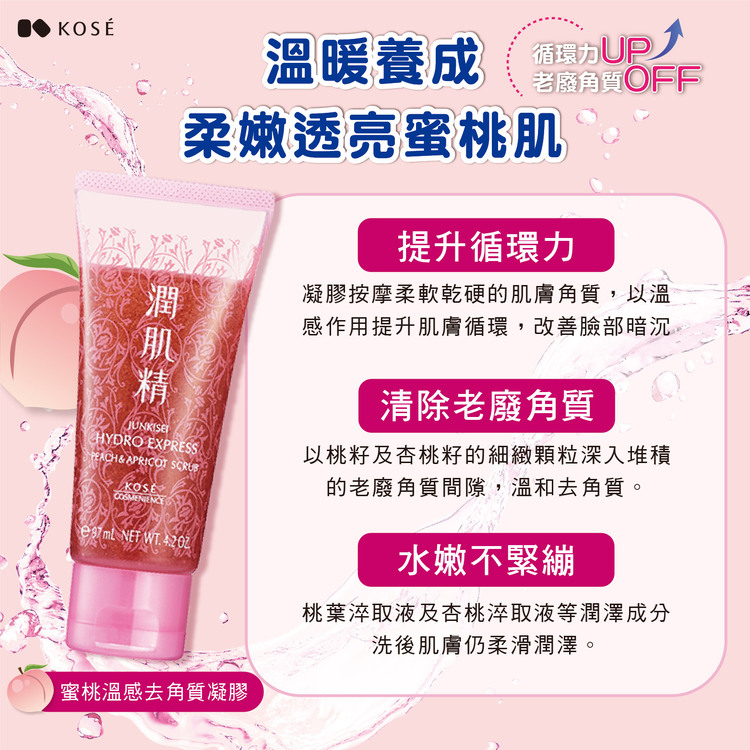 老廢角質OFF:添加桃籽顆粒、杏桃籽顆粒的溫感去角質按摩凝膠,能深入堆積的老廢角質間隙並將其包覆,給予肌膚潤澤的同時能溫和去除毛孔老廢角質,養成柔嫩透亮蜜桃肌。
