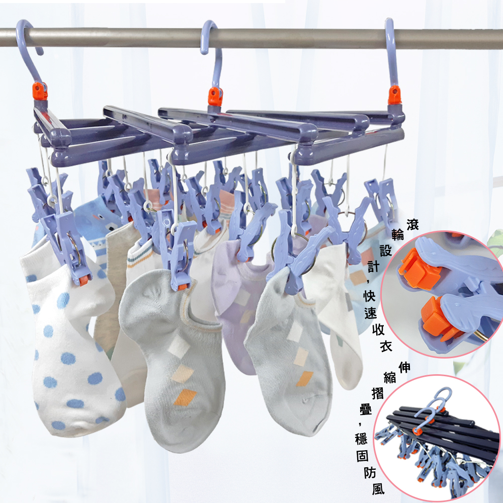 .旋轉掛頭,三掛頭設計,可360度旋轉,可有效防止衣物掉落。 .滾輪式夾子頭設計,有效防滑,夾物緊不易掉落,可快速收衣。 .可伸縮折疊,依據衣物,曬衣空間大小來調節適合的長寬。不用時折疊收納節省空間。
